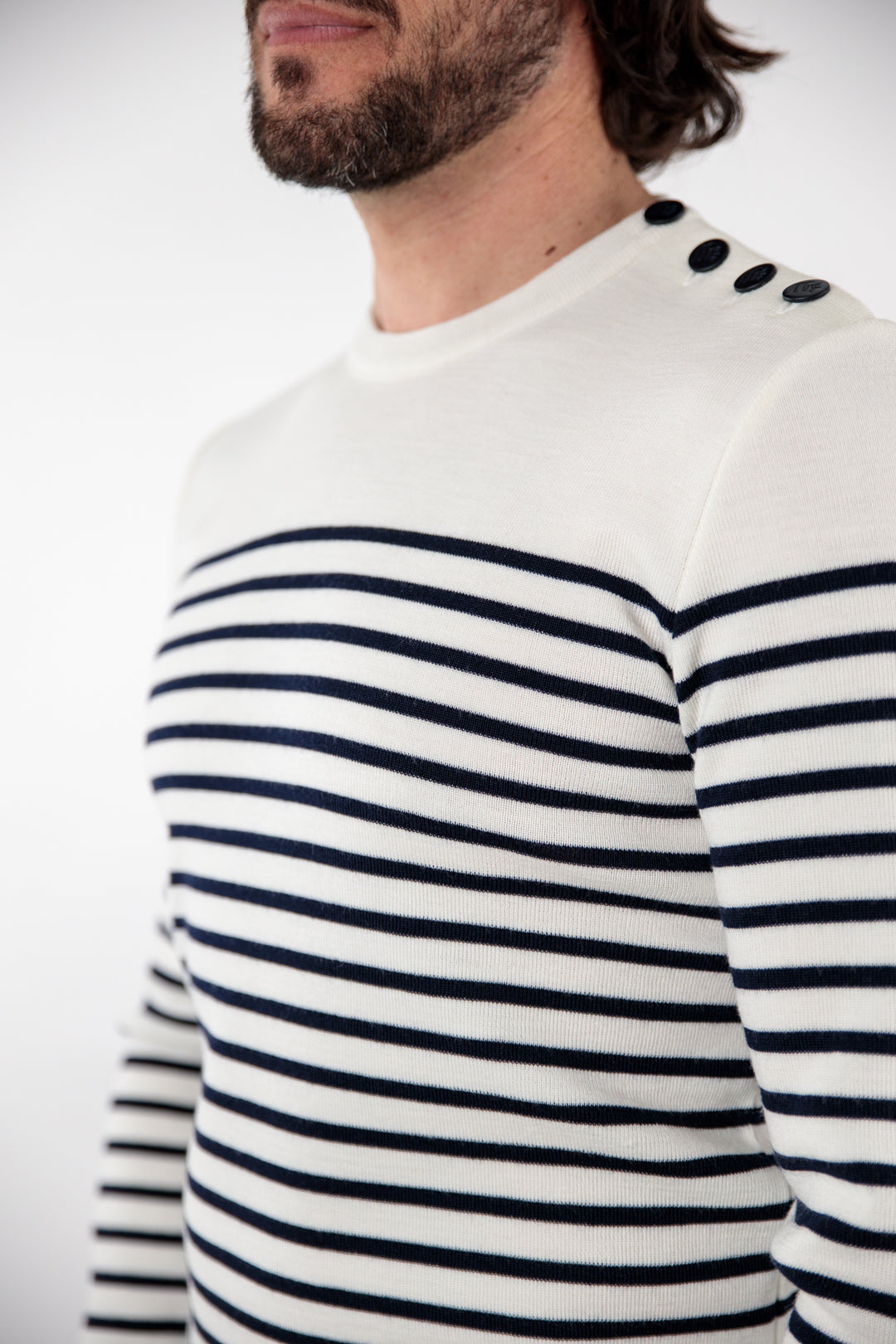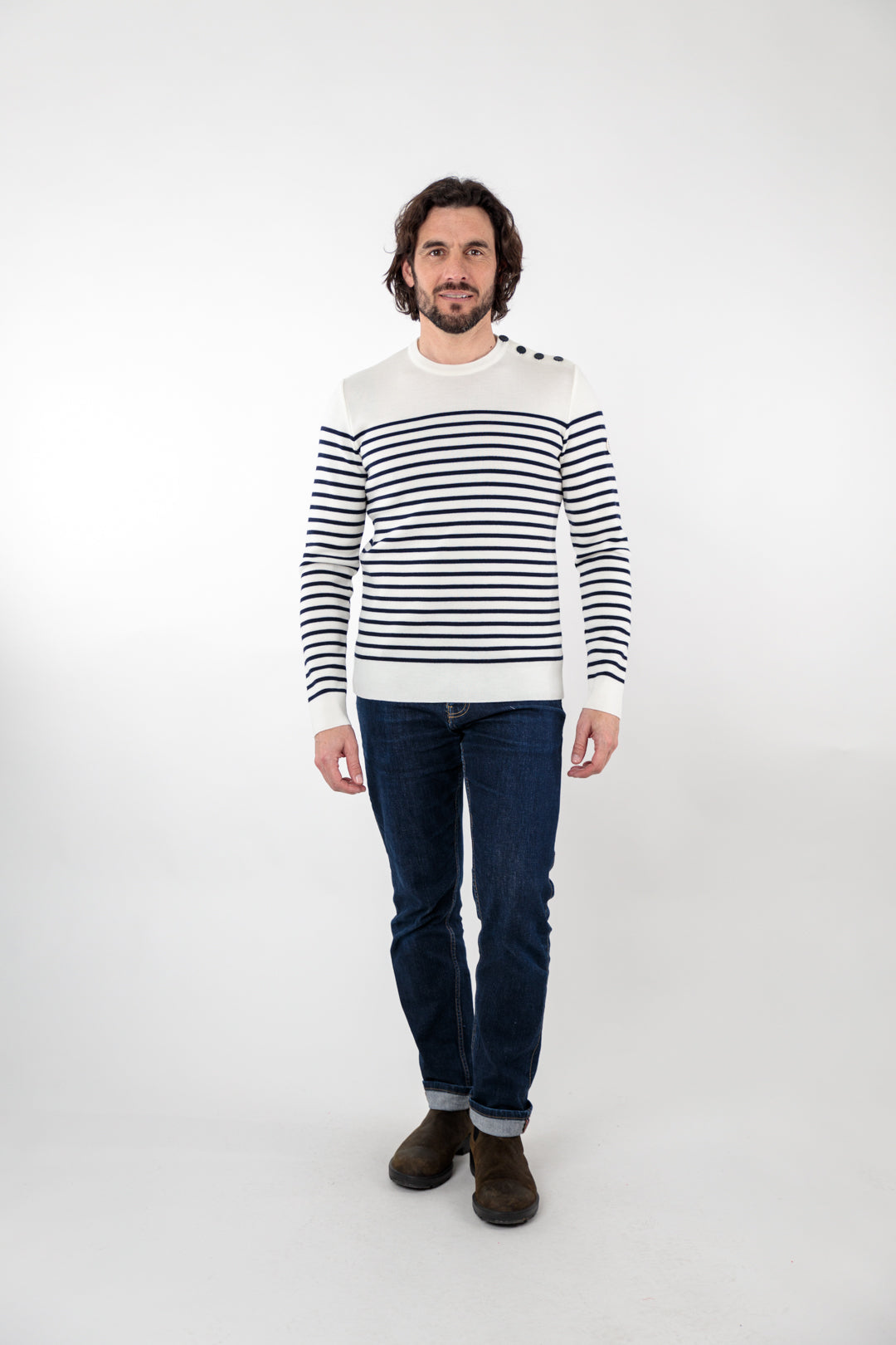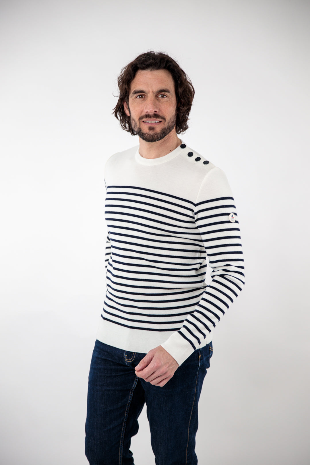 Craquez pour le pull Klasel en version rayée ! Ce pull marin de de qualité emblématique de la marque Royal Mer propose une ligne modernisée avec sa coupe droite et plus ajustée. Sa texture douce est composée à 100% de pure laine mérinos.