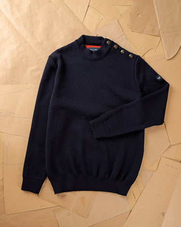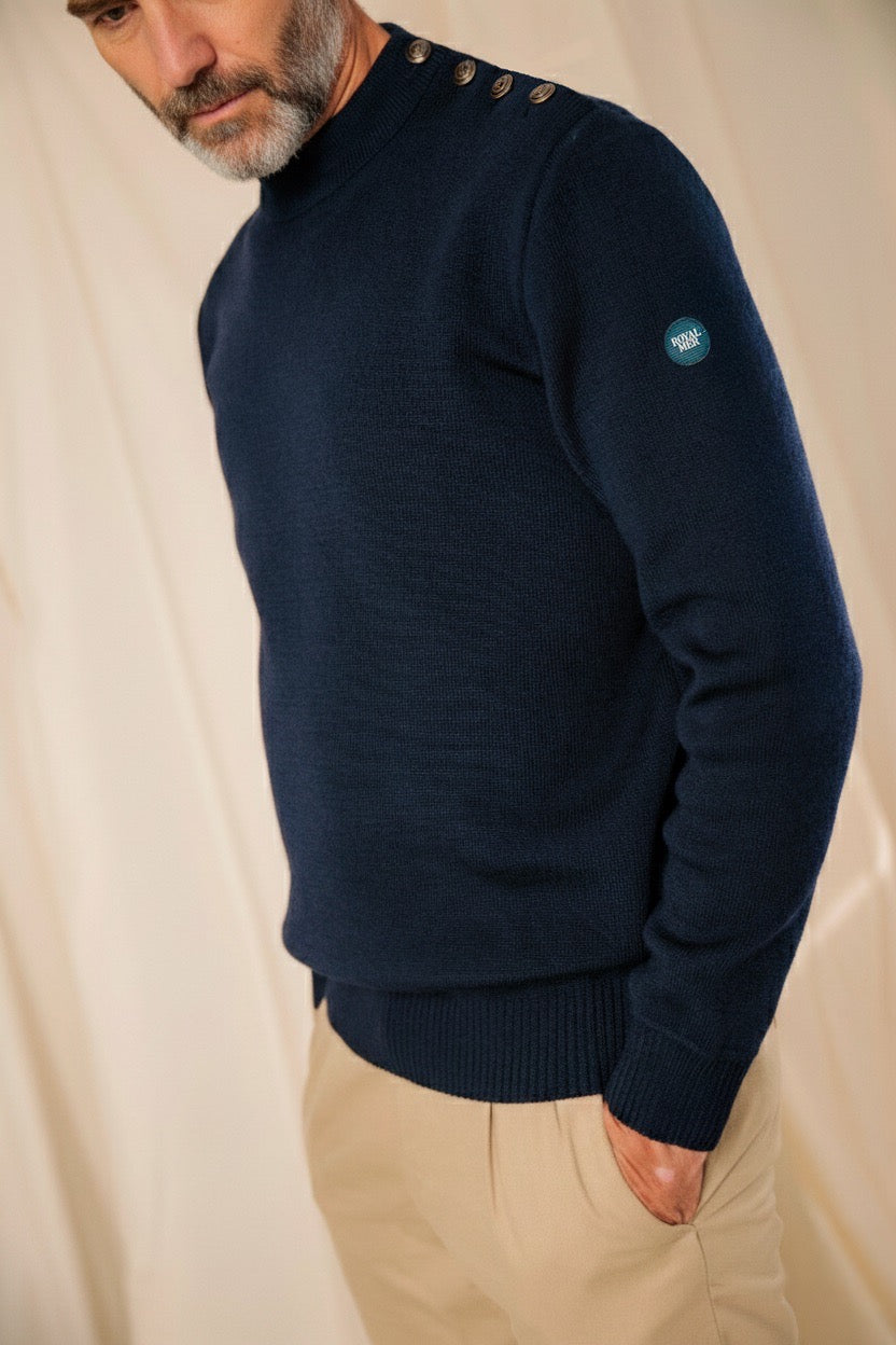 Ce pull se distingue par sa coupe classique et son col marin, qui lui confèrent un style à la fois décontracté et sophistiqué. Les manches longues et le boutonnage sur l'épaule gauche, agrémenté de boutons en bronze, ajoutent une touche maritime qui rend ce vêtement unique.