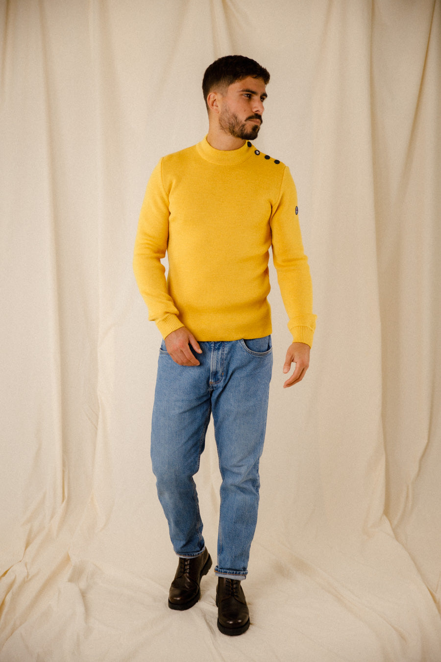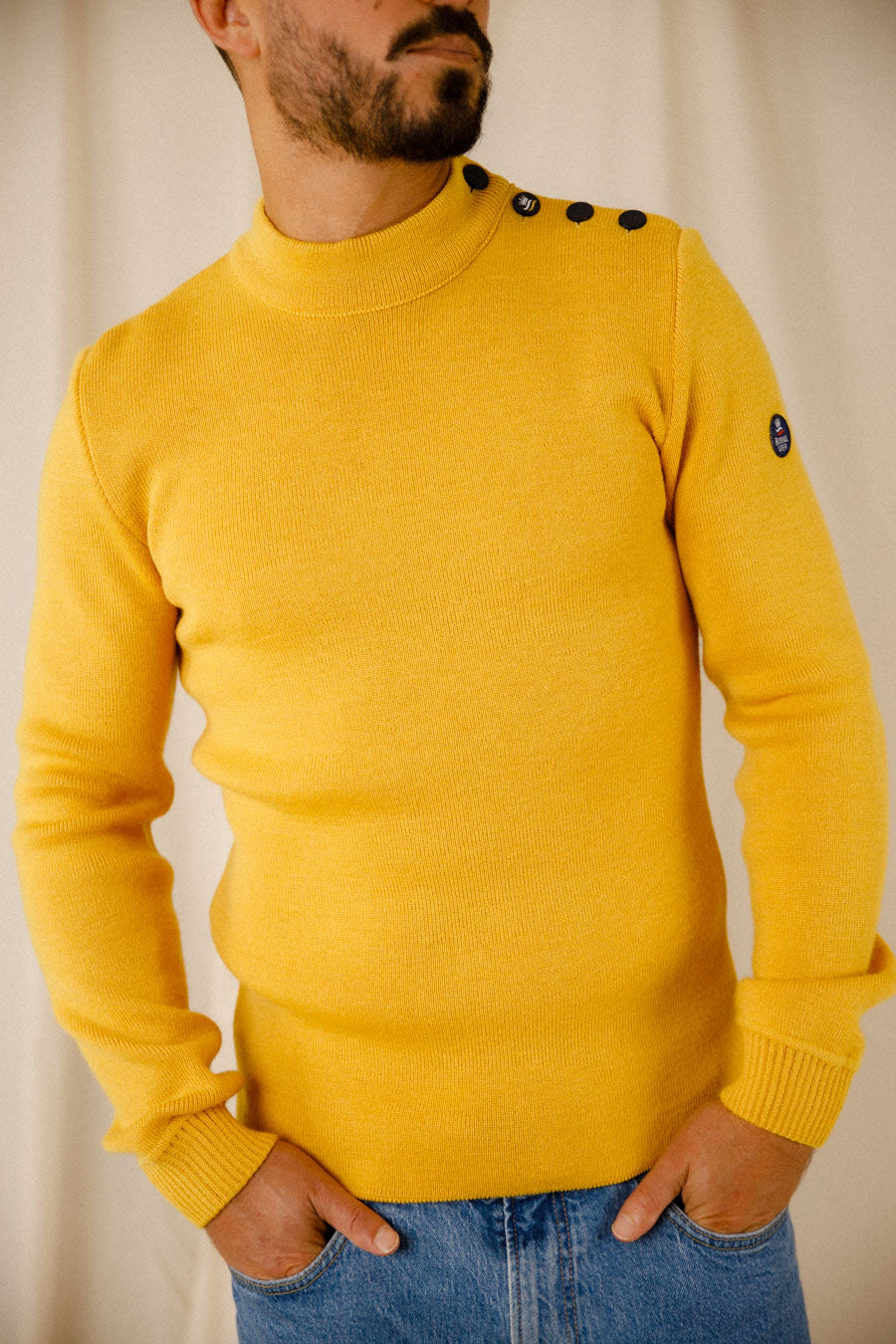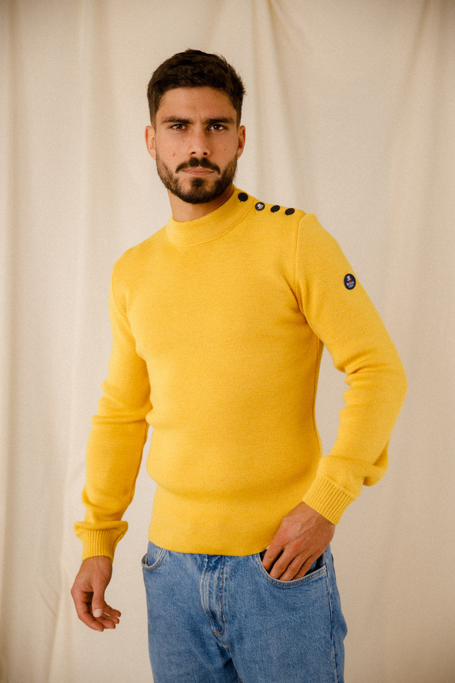 Le pull marin uni Adrian se distingue par sa couleur jaune vif, apportant une note de fraîcheur et de dynamisme à votre garde-robe. Confectionné en 100% laine vierge, ce pull offre chaleur et confort, tout en garantissant une allure moderne et raffinée grâce à son col montant.