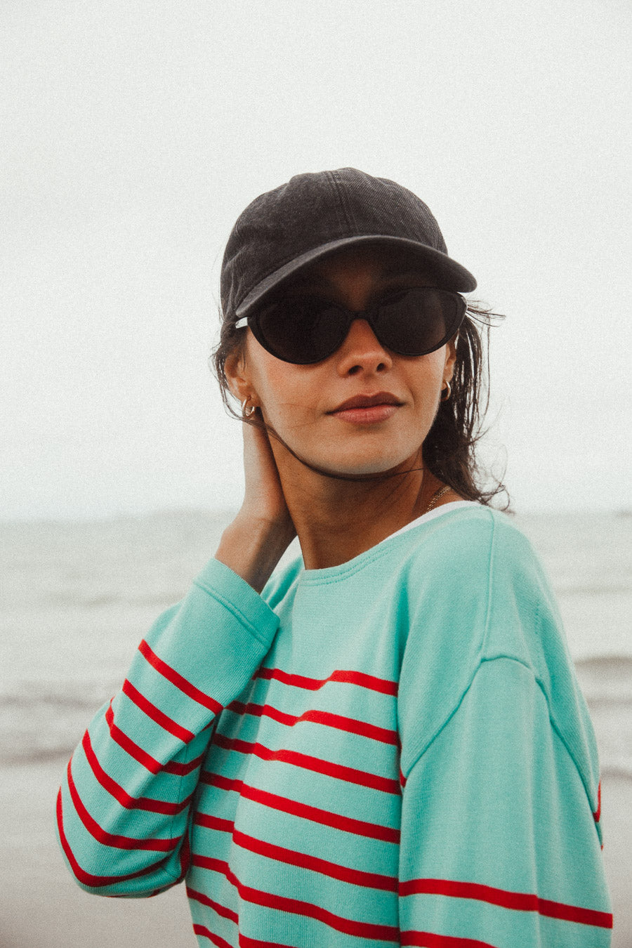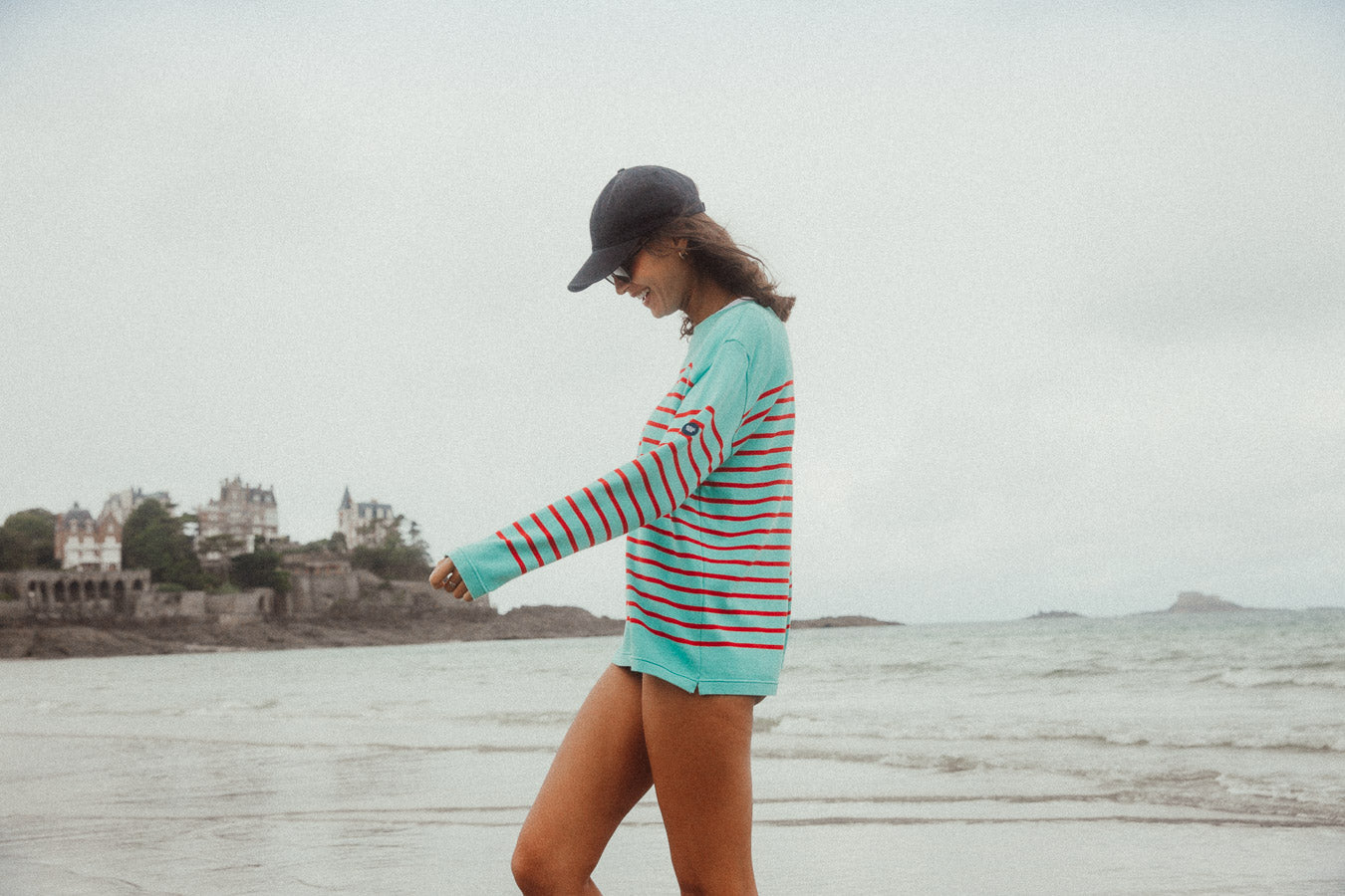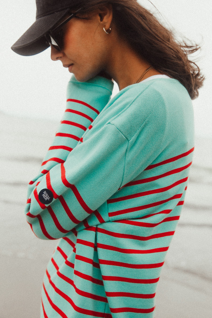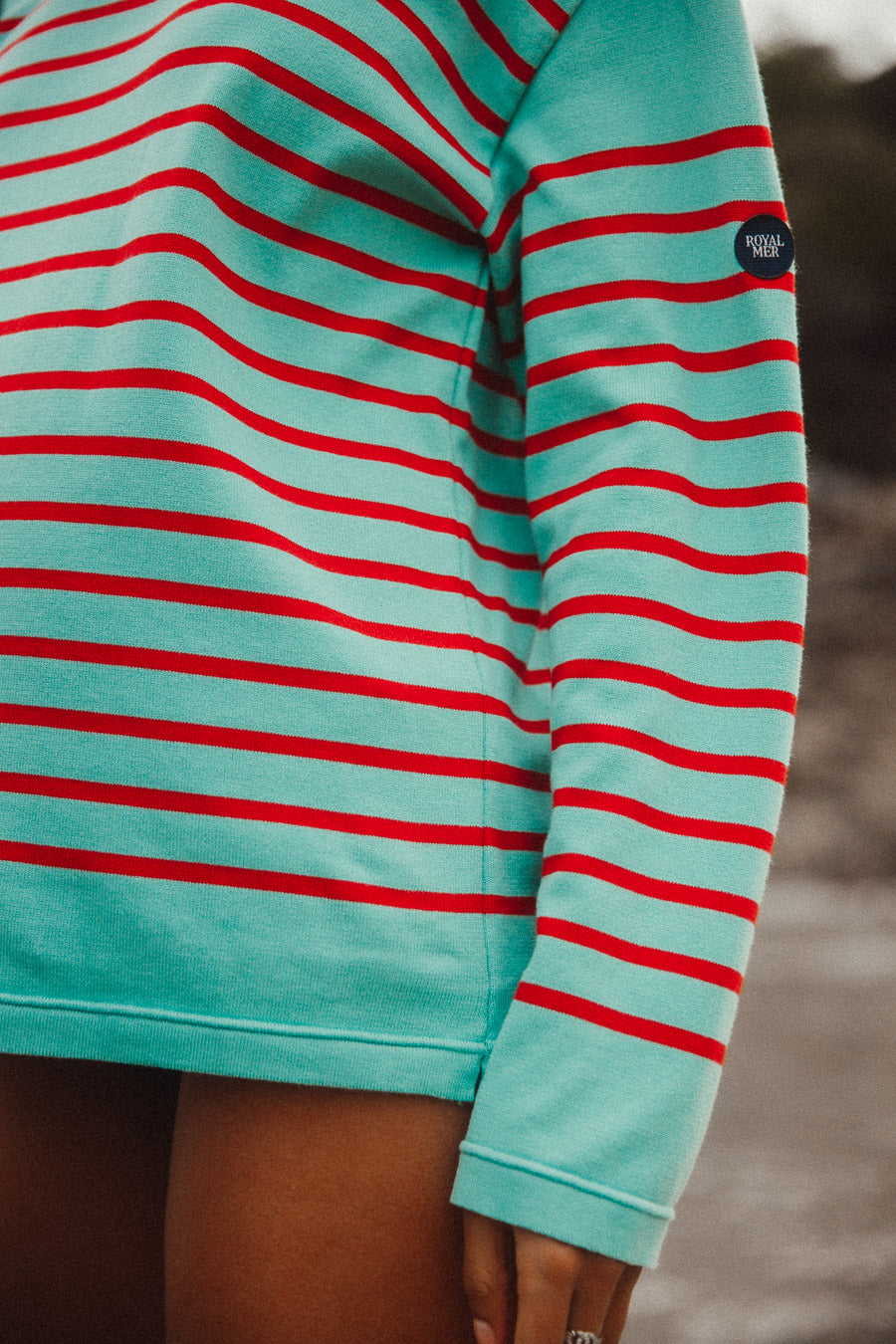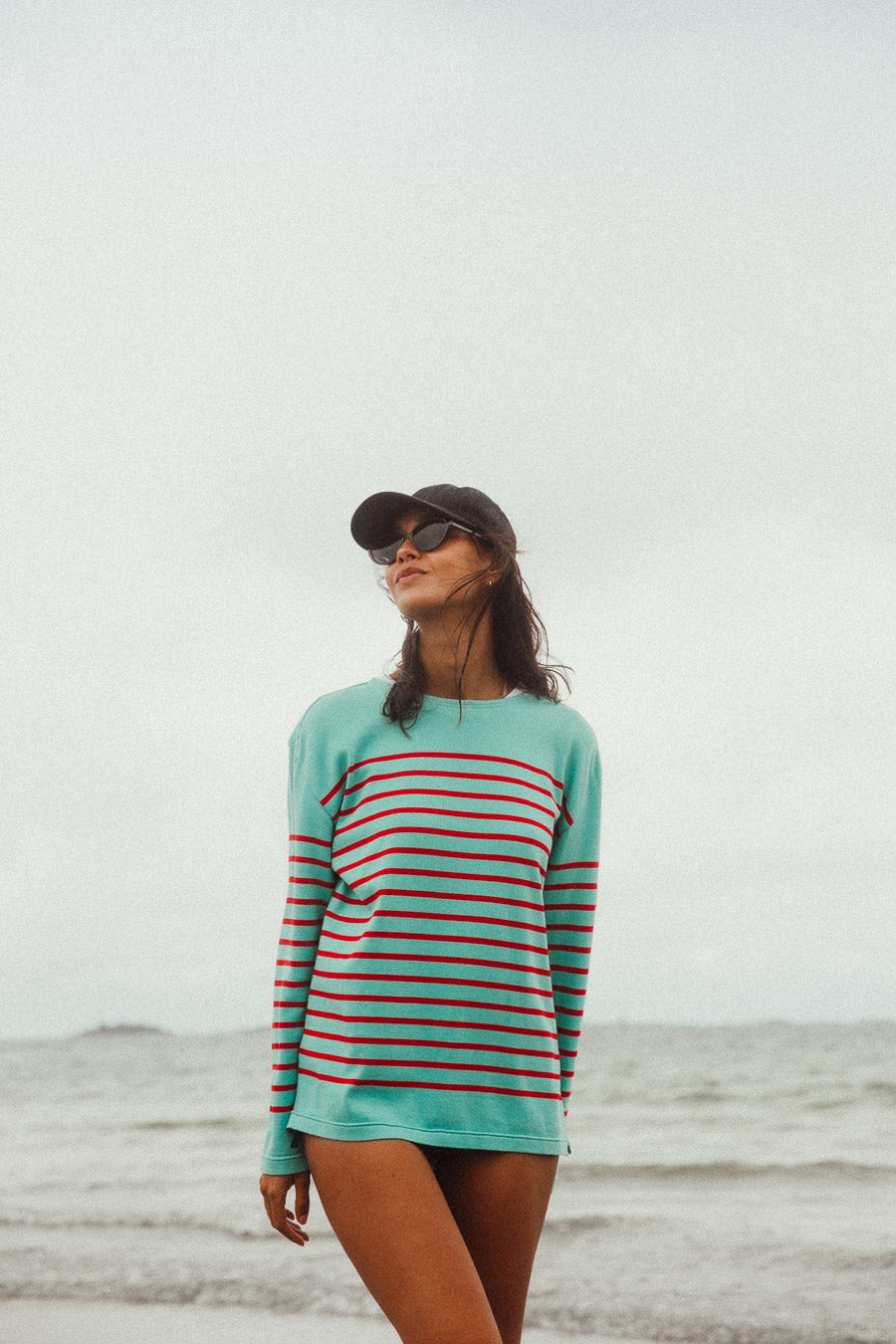 Pull Marinière Flo en coton égyptien, un incontournable de votre garde-robe estivale. Ce pull se distingue par sa couleur turquoise ornée de rayures horizontales rouges, apportant une touche dynamique et fraîche à votre style.