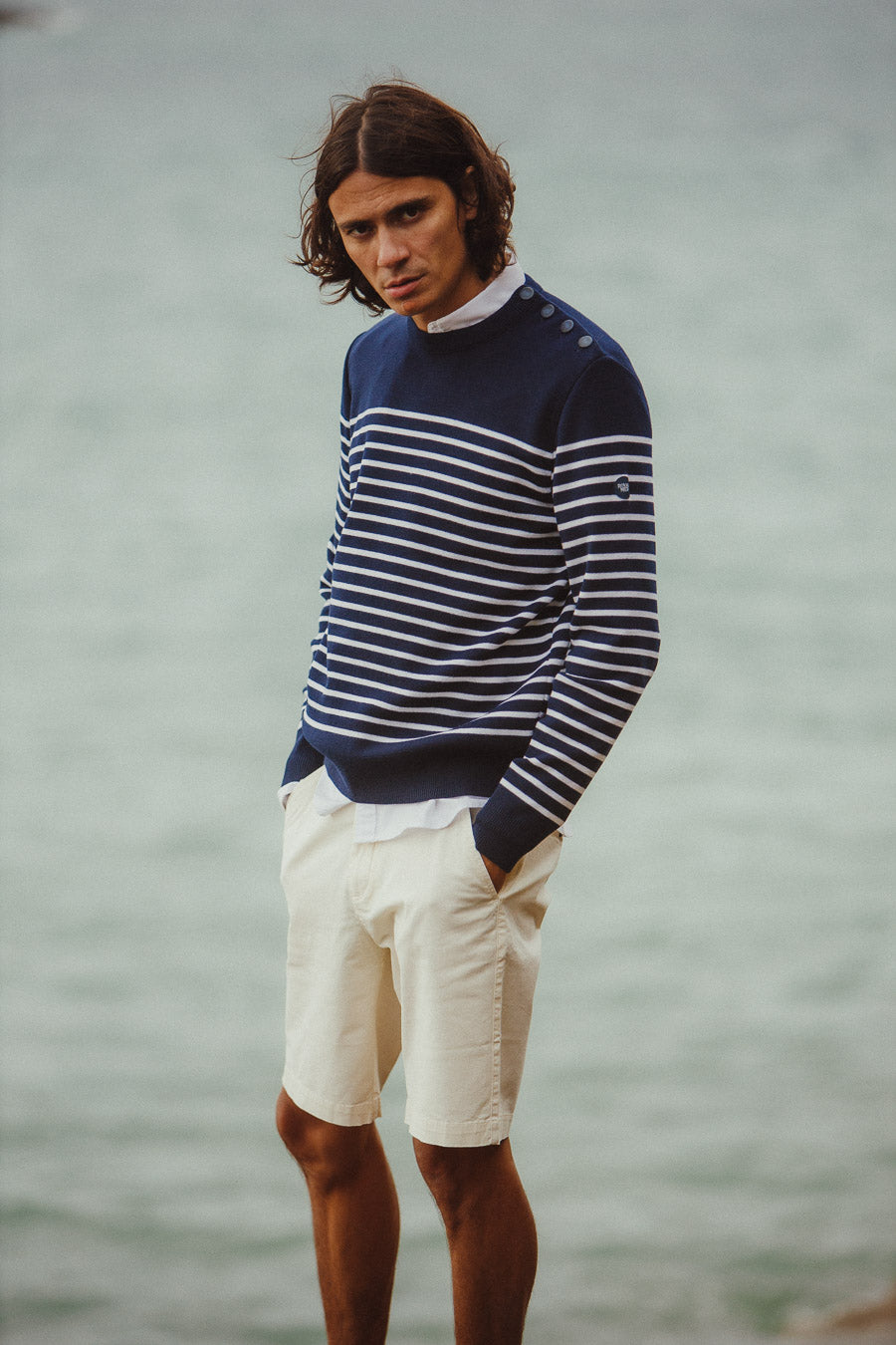 Pull marin rayé Armel en laine mérinos fine certifiée RWS (Responsible Wool Standard), garantissant une provenance éthique et respectueuse du bien-être animal. Ce pull arbore une belle combinaison de couleurs bleu marine et écru, avec des rayures horizontales qui lui confèrent un style classique et intemporel.