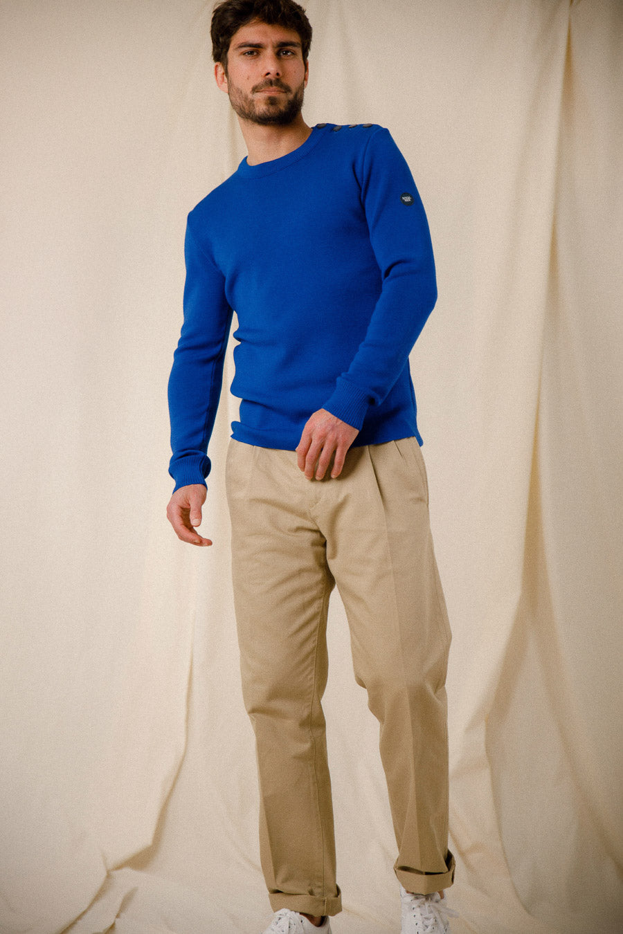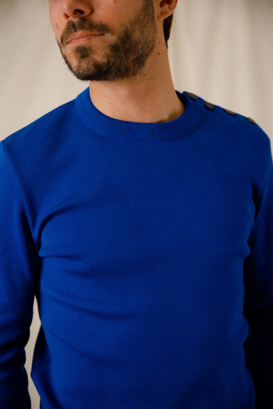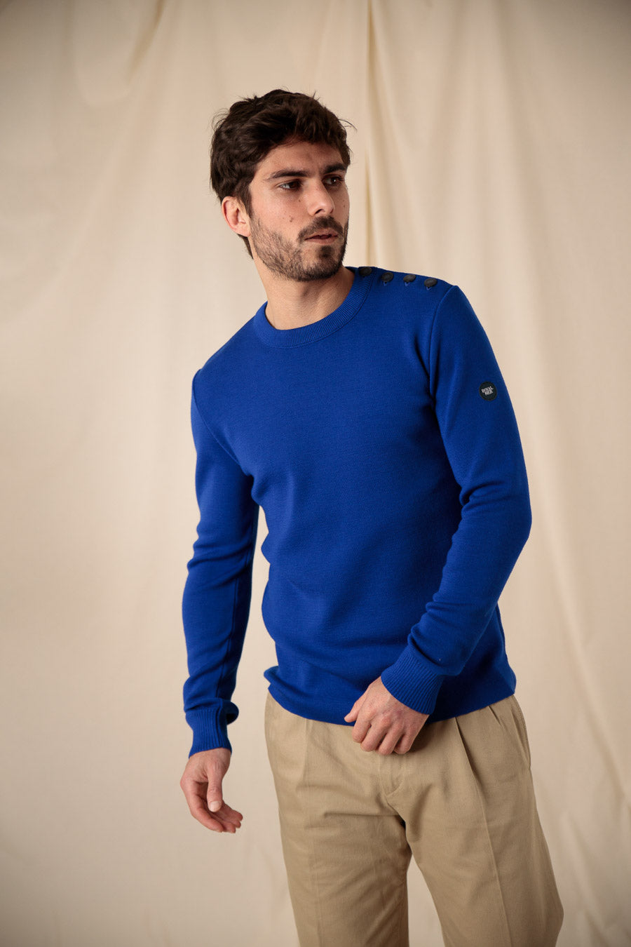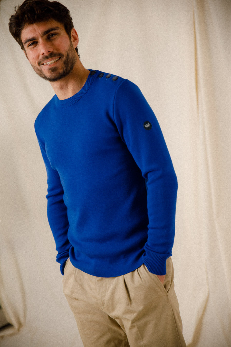 Un des éléments notables de ce pull est le boutonnage sur l'épaule, ajoutant une touche de style maritime tout en restant fonctionnel. Ce détail, associé à un petit logo sur la manche, témoigne de l'attention portée à la qualité et au design.