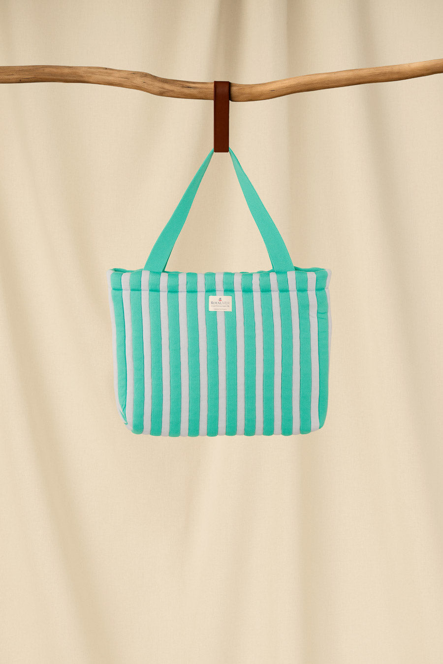 Le moyen cabas rayé Gaby est un accessoire incontournable pour ceux qui recherchent à la fois style et praticité. Fabriqué en 100% coton, ce sac arbore un motif à rayures verticales dans des teintes de ciel et diabolo, offrant un look dynamique et frais.
