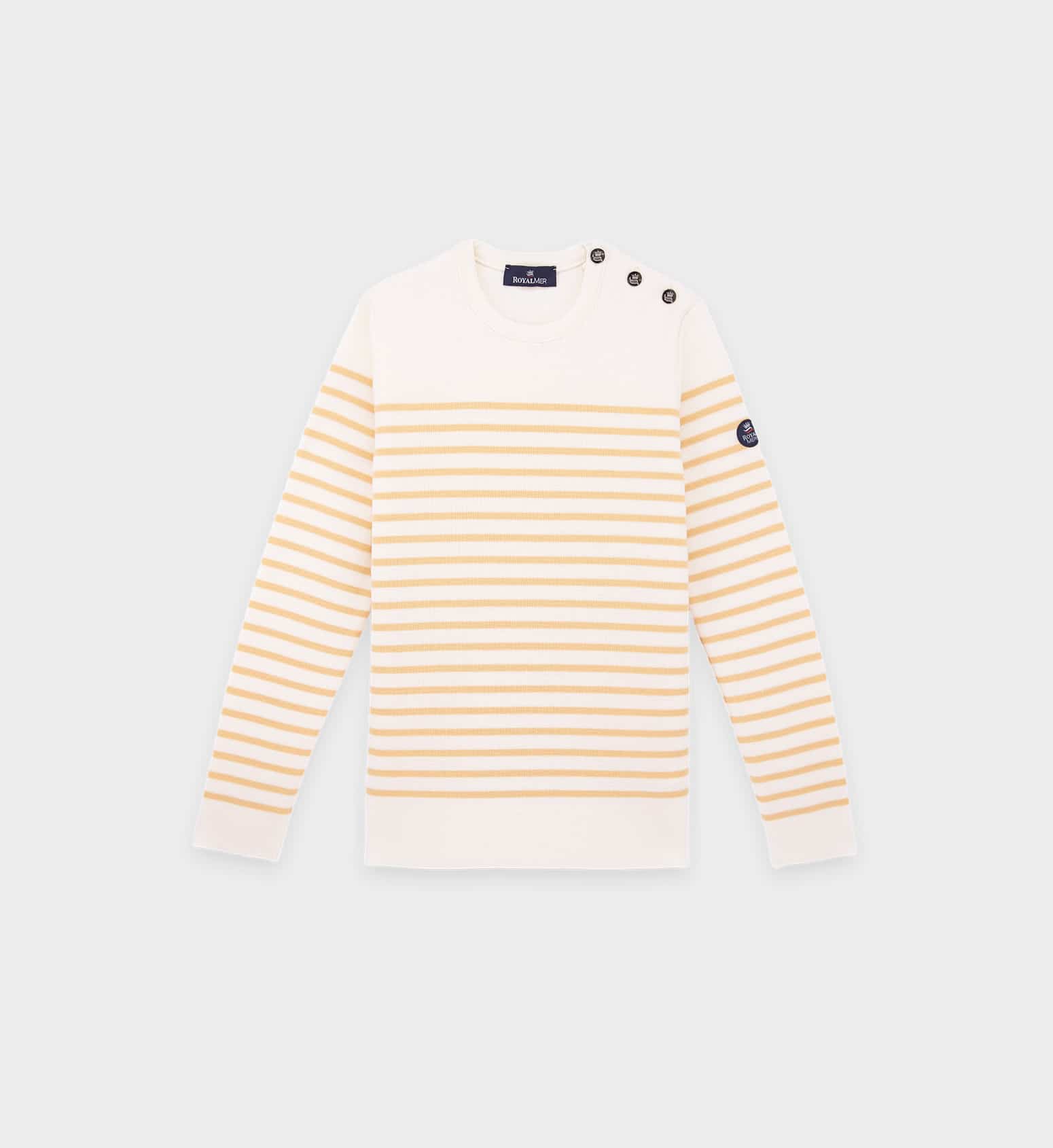 Le pull marin rayé Klasel F1 : l’indispensable! Le Klasel en coloris Limoncello avec sa coupe droite et plus ajustée donne un look moderne au pull marin traditionnel. Tricoté en 100% pure laine mérinos fine, ce pull en laine de qualité ne vous laissera pas tomber de sitôt !