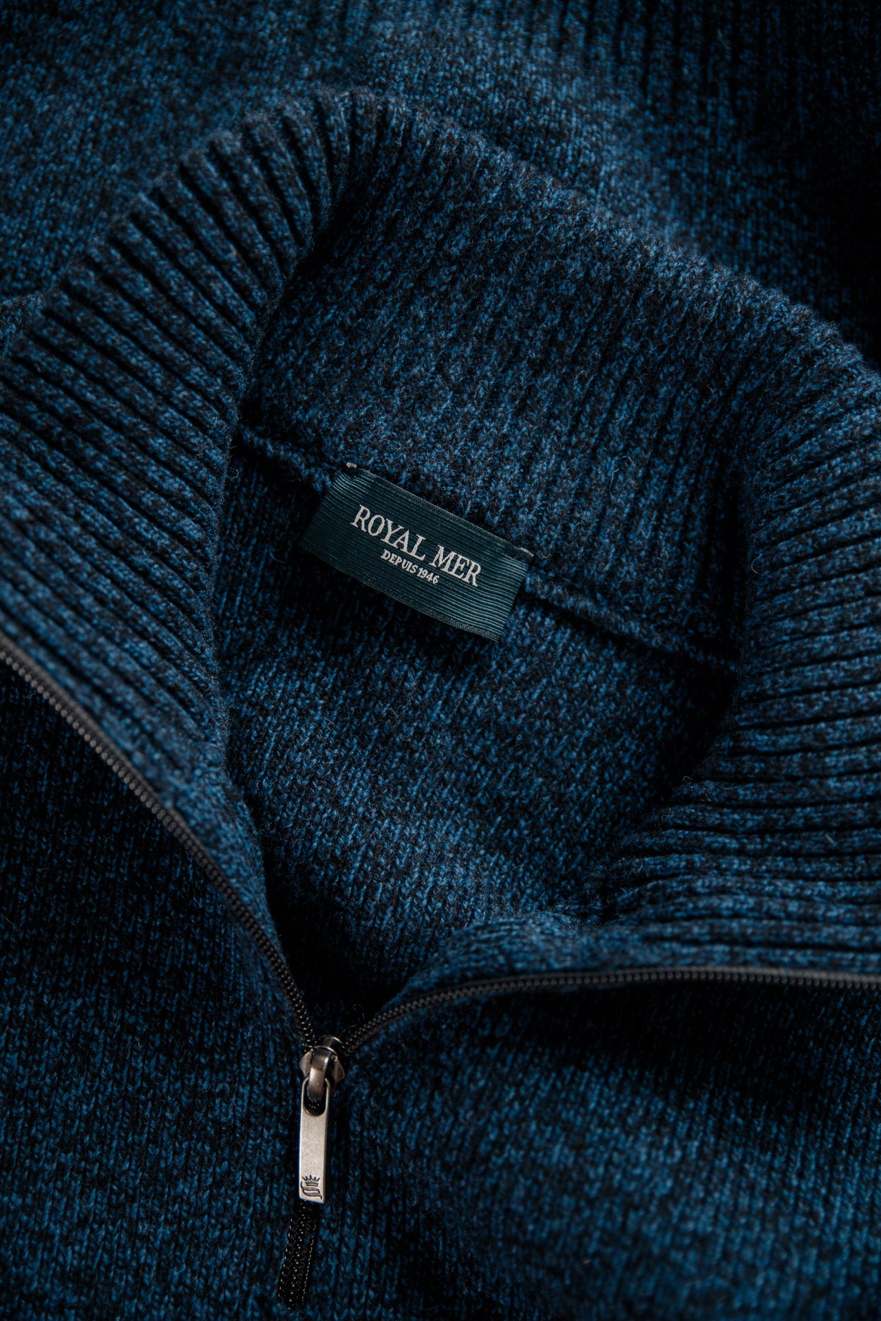 Le tricotage en maille côte 1/1 et les finitions côtelées au niveau des poignets et du col renforcent le style tout en garantissant une isolation optimale contre le froid. Sa teinte bleu foncé, avec un effet chiné, donne au pull une texture riche et attrayante.