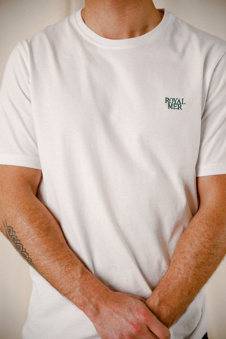 Le tee-shirt arbore une broderie verte du logo Royal Mer sur la poitrine, ajoutant une touche d'élégance discrète à ce vêtement classique. Sa coupe régulière avec des manches courtes et un col rond en fait un incontournable pour un style décontracté.