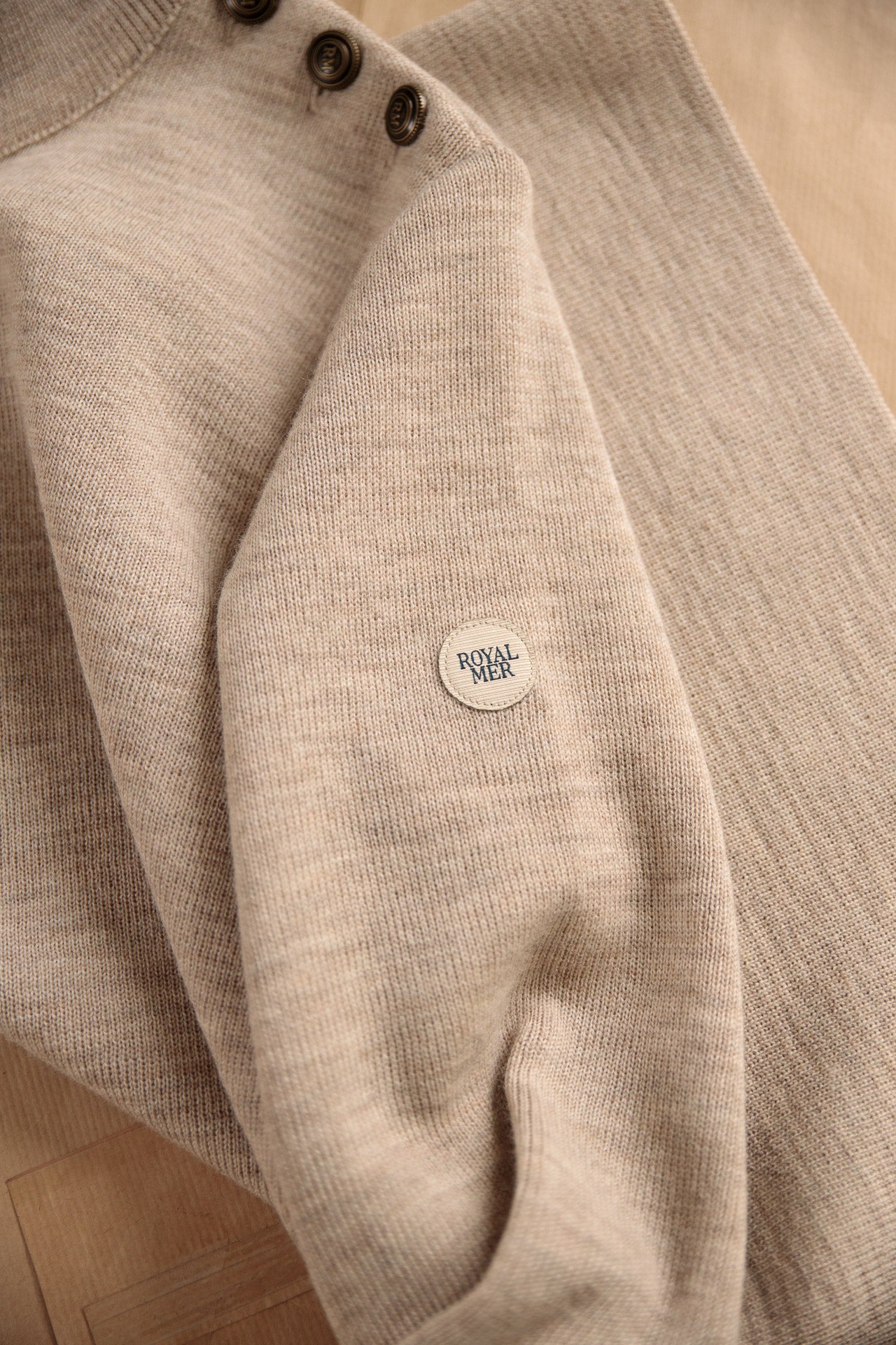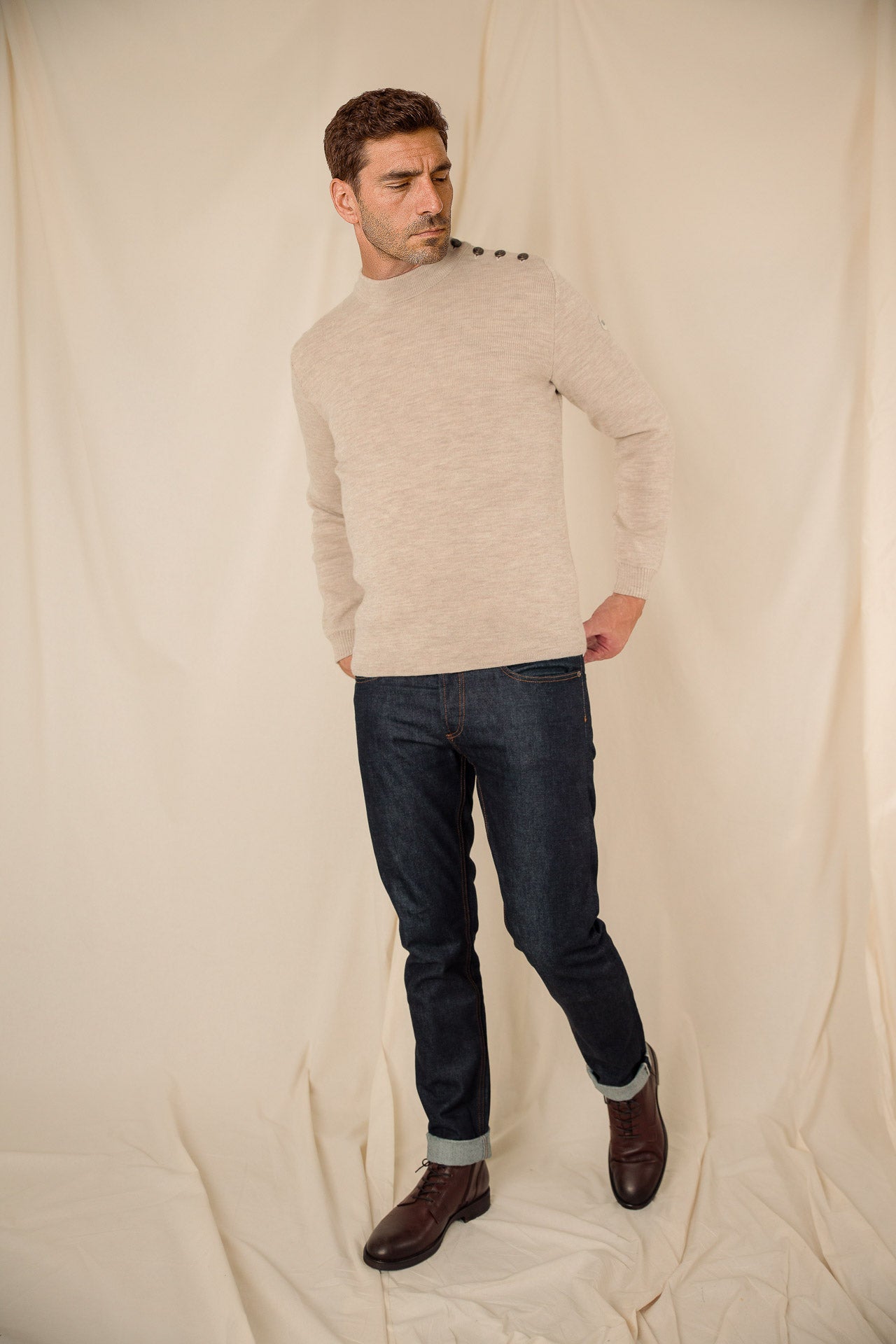 Confectionné en 100 % laine vierge, ce pull assure une douceur et un confort exceptionnels. Sa coupe ajustée et son col marin lui confèrent une allure classique, tandis que le boutonnage sur l'épaule gauche avec des boutons en bronze ajoute une touche d'originalité et de style maritime.