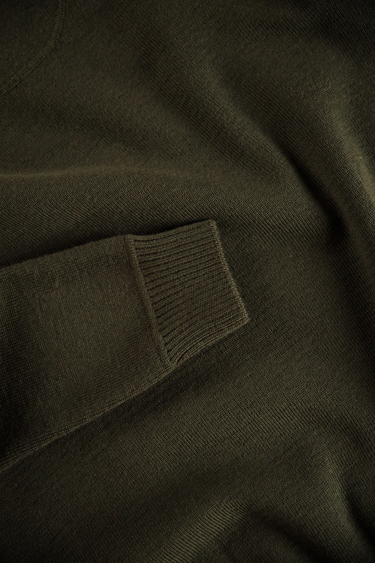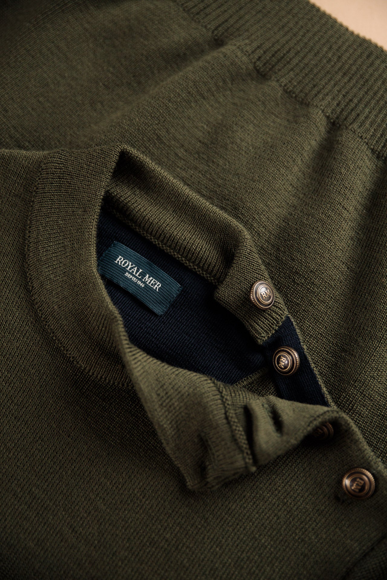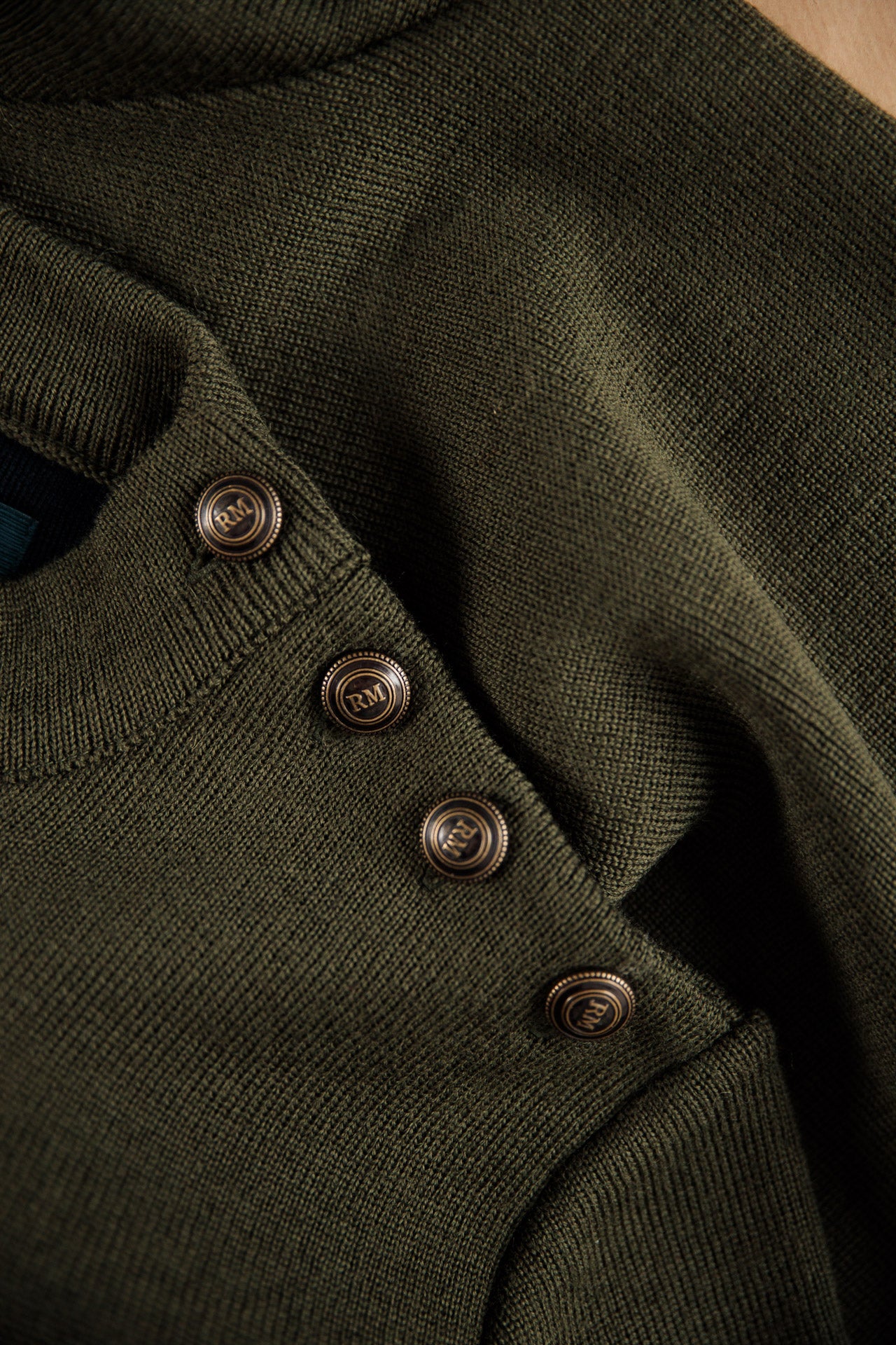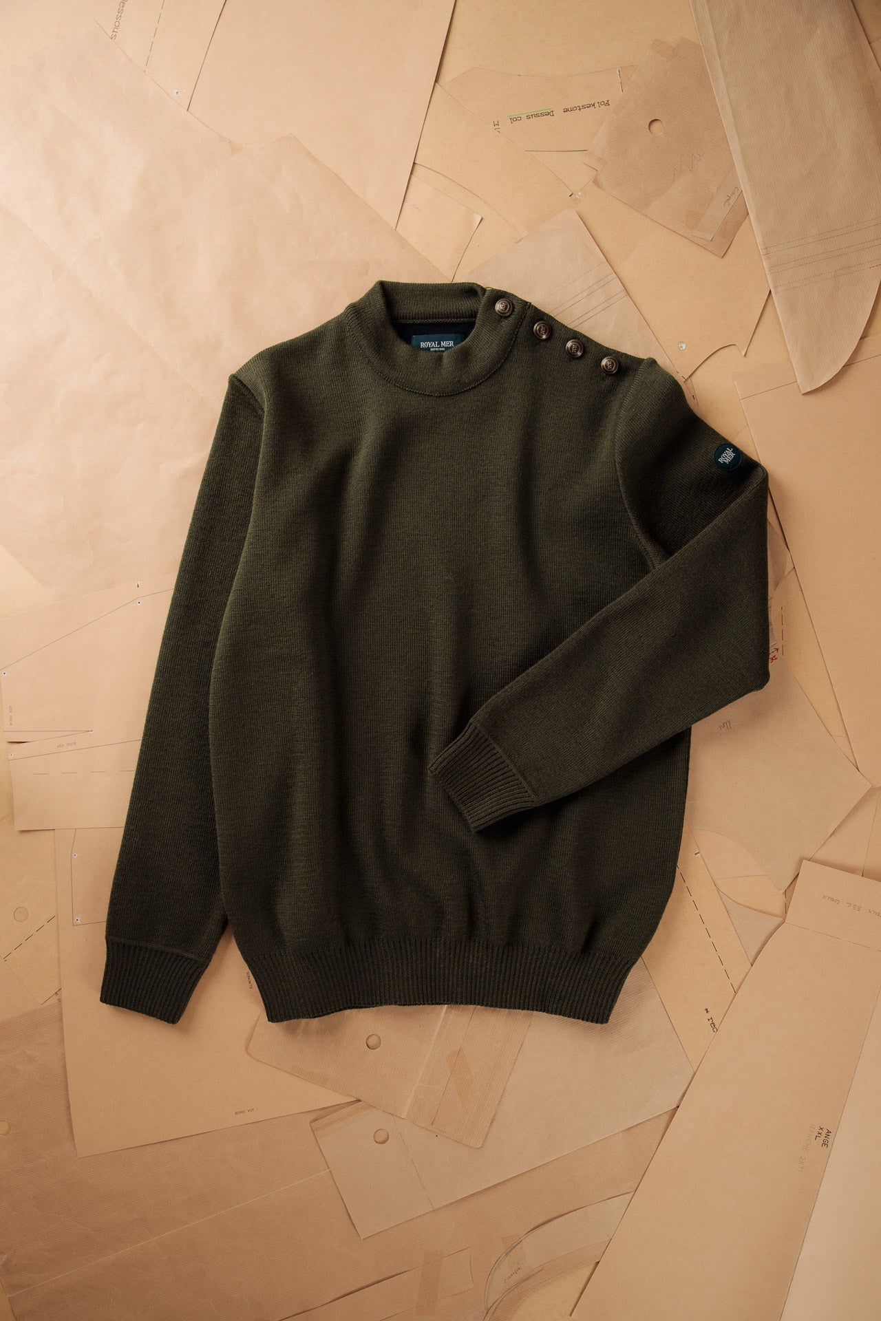 Ce pull se distingue par sa couleur vert olive, une teinte sobre et raffinée qui s'adapte facilement à diverses tenues. Sa coupe classique avec un col marin et des manches longues en fait un choix polyvalent, idéal pour les saisons fraîches.