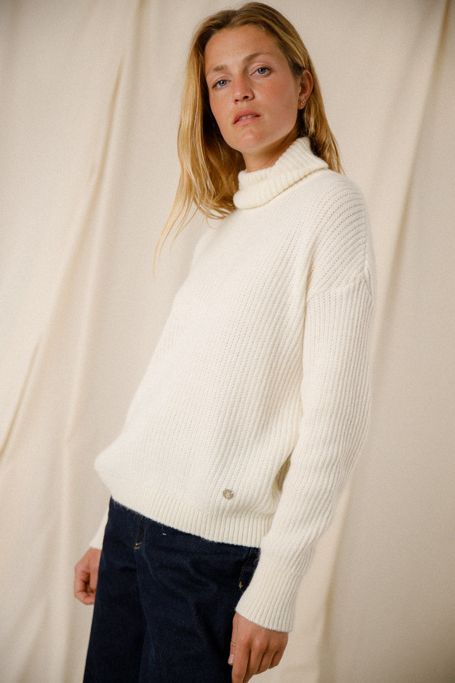 Composé également de 34% de polyamide, 30% d'acrylique et 8% de polyester, ce pull allie légèreté et durabilité. Sa teinte écru lui confère une allure intemporelle, tandis que le col roulé ajoute une touche de sophistication et de protection contre le froid.