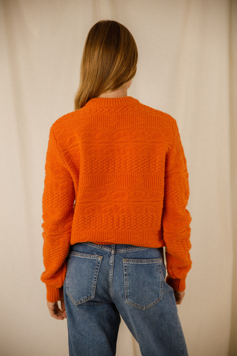 Pull Laurian en orange, confectionné en 100 % laine vierge, allie confort et style. Ce pull à l'encolure ronde présente un volume confort et un tricotage en maille "archive" qui lui confère une texture riche et agréable au toucher.