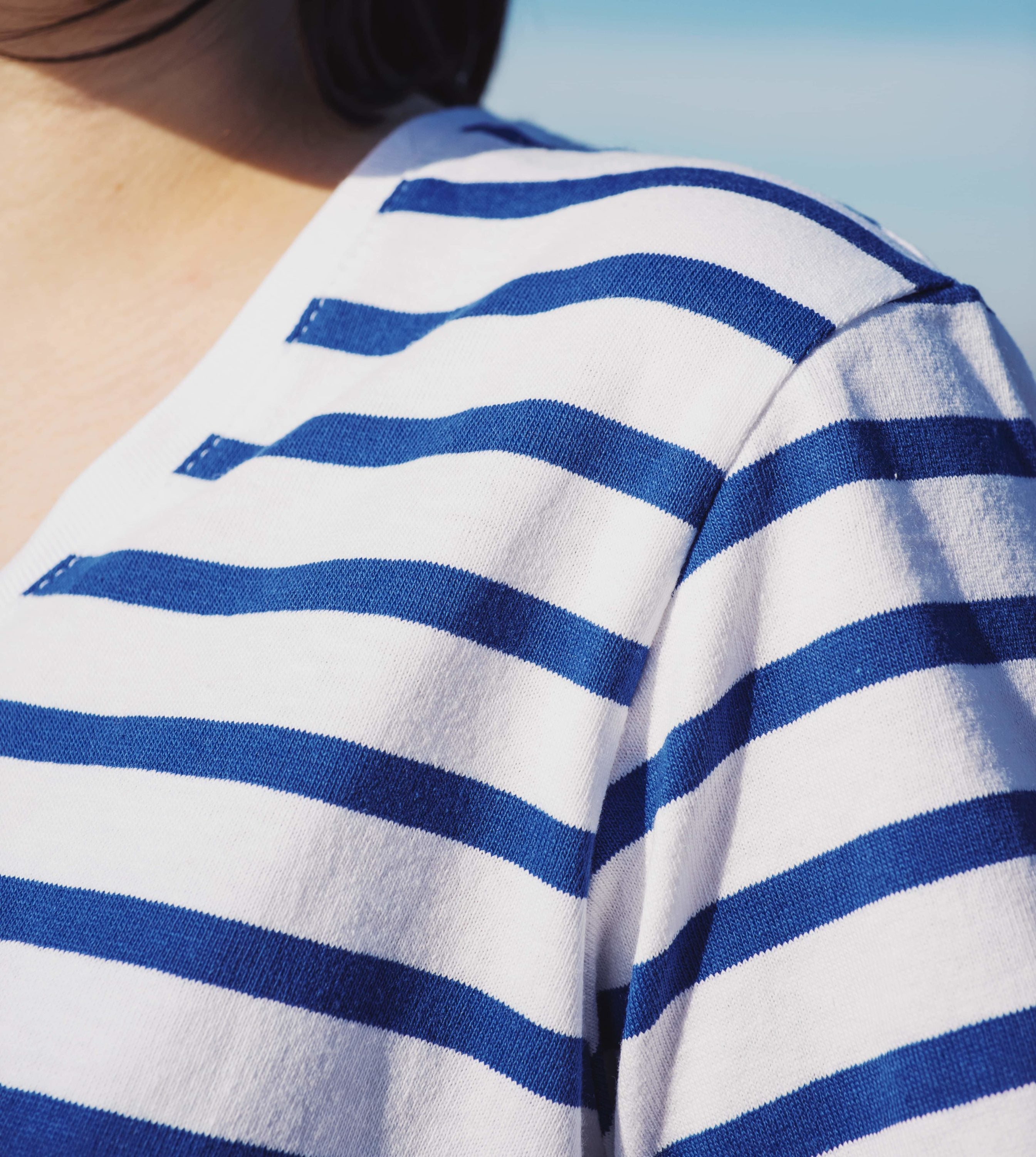 Mettez de la couleur dans votre garde robe avec Anita V. T-shirt rayé bicolore en col V 100% Coton Open End blanc et bleu electrico.