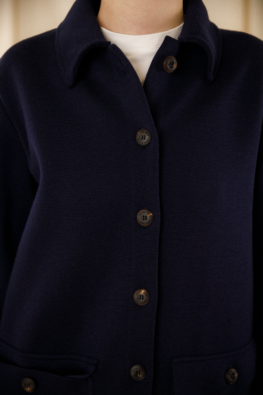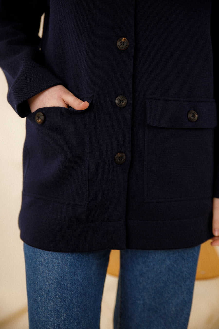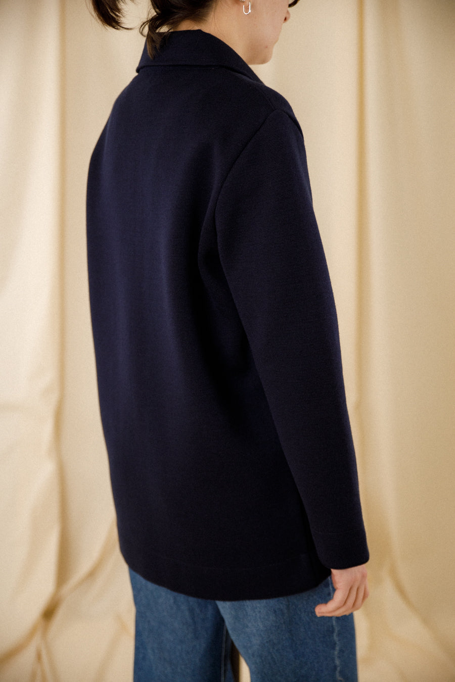 - Veste droite boutonnée bleu marine en laine mérinos fine