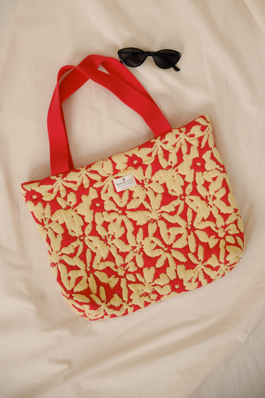 Avec des dimensions de 46 cm de largeur et 37 cm de hauteur, ce cabas offre un espace généreux pour transporter tous vos essentiels, que ce soit pour une journée à la plage, des courses ou une sortie en ville. Sa forme rectangulaire et ses anses larges en rouge garantissent un confort optimal lors du transport.