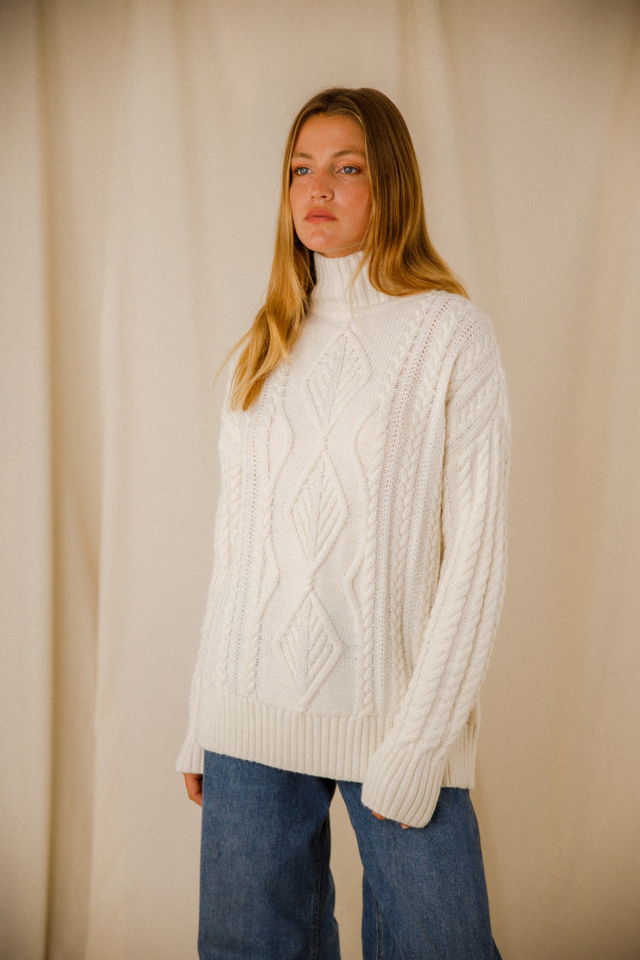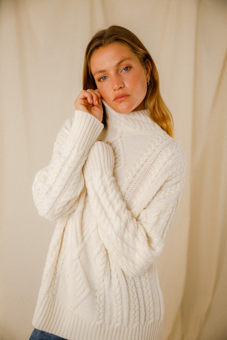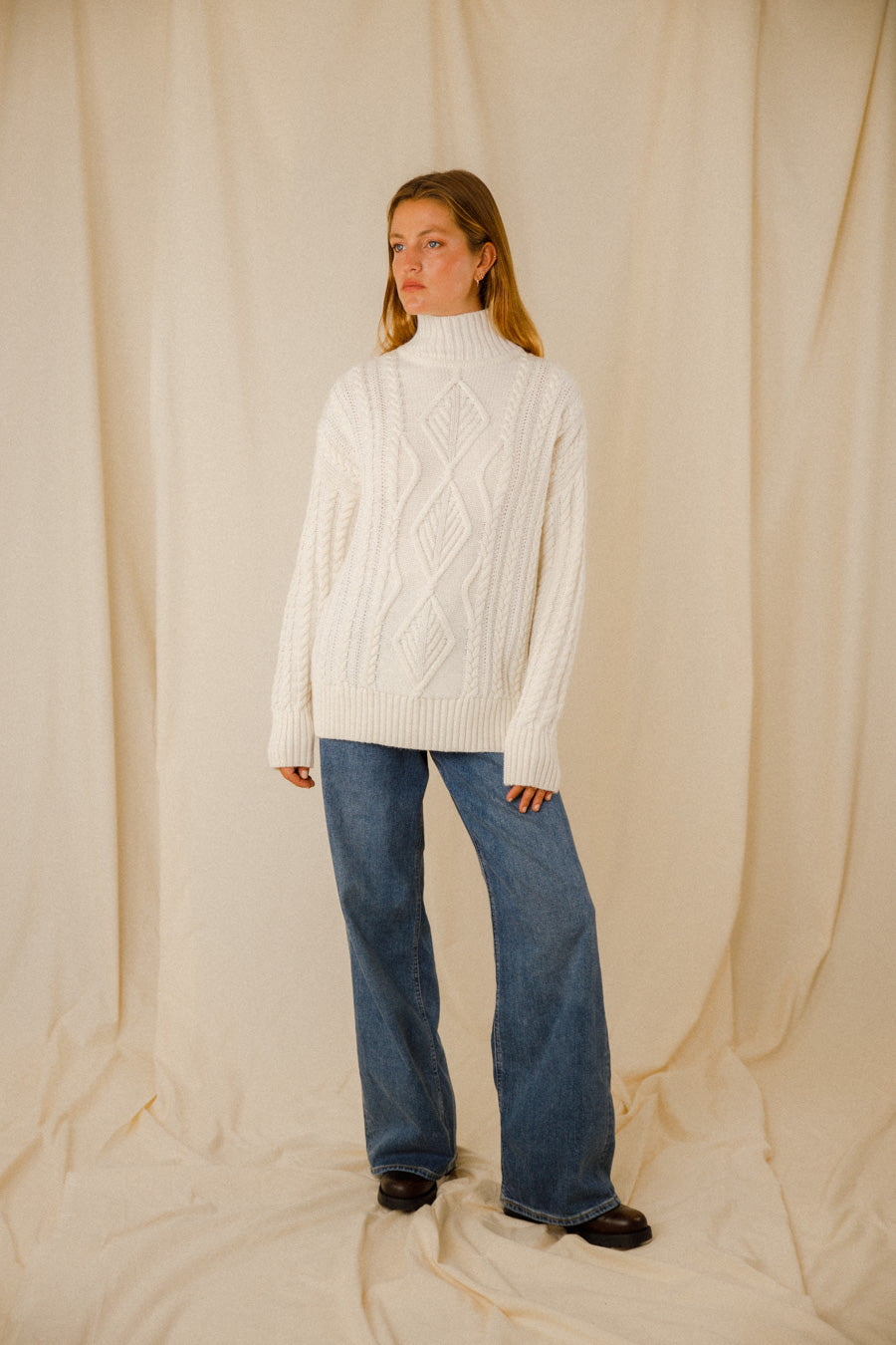 Découvrez l’élégance décontractée et le confort absolu avec notre pull Chiara. Le col montant du pull Chiara ajoute une touche de sophistication à votre tenue, vous permettant de rester bien au chaud tout en restant à la pointe de la mode. Les manches tombantes apportent une fluidité subtile à votre silhouette. Les larges bords-côtes au bas du corps et des manches non seulement embellissent le pull, mais contribuent également à son ajustement confortable. Au cœur du design se trouve un médaillon doré, positionné avec élégance au milieu de l’encolure arrière du pull. Ce détail délicat ajoute une touche de glamour discret, rehaussant encore plus l’attrait de ce pull. Fabriqué à partir d’une maille torsadée exquise, le pull Chiara est composé de matériaux de haute qualité : 20 % d’alpaga pour la douceur, 30 % de laine pour une chaleur naturelle et 50 % d’acrylique pour une durabilité et une facilité d’entretien. Composition : 20 % Alpaga – 30 % Laine – 50 % Acrylique