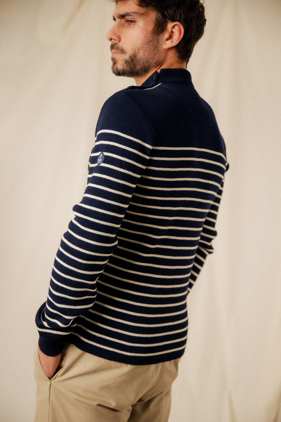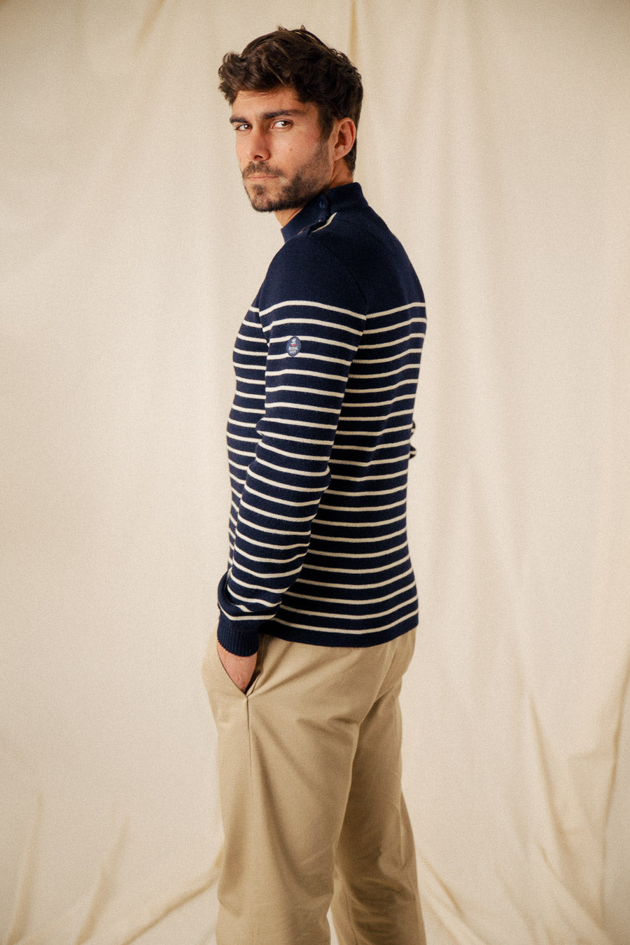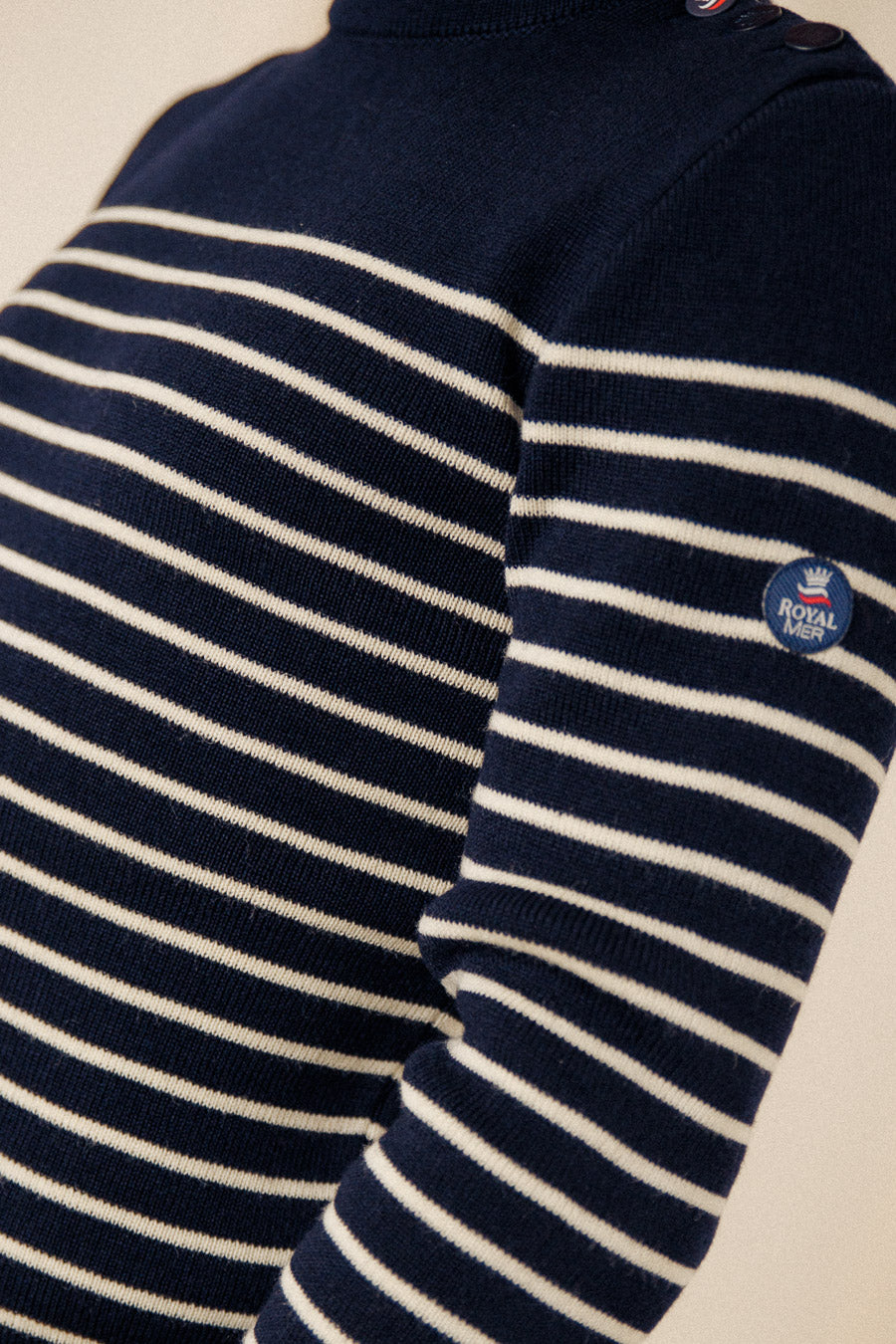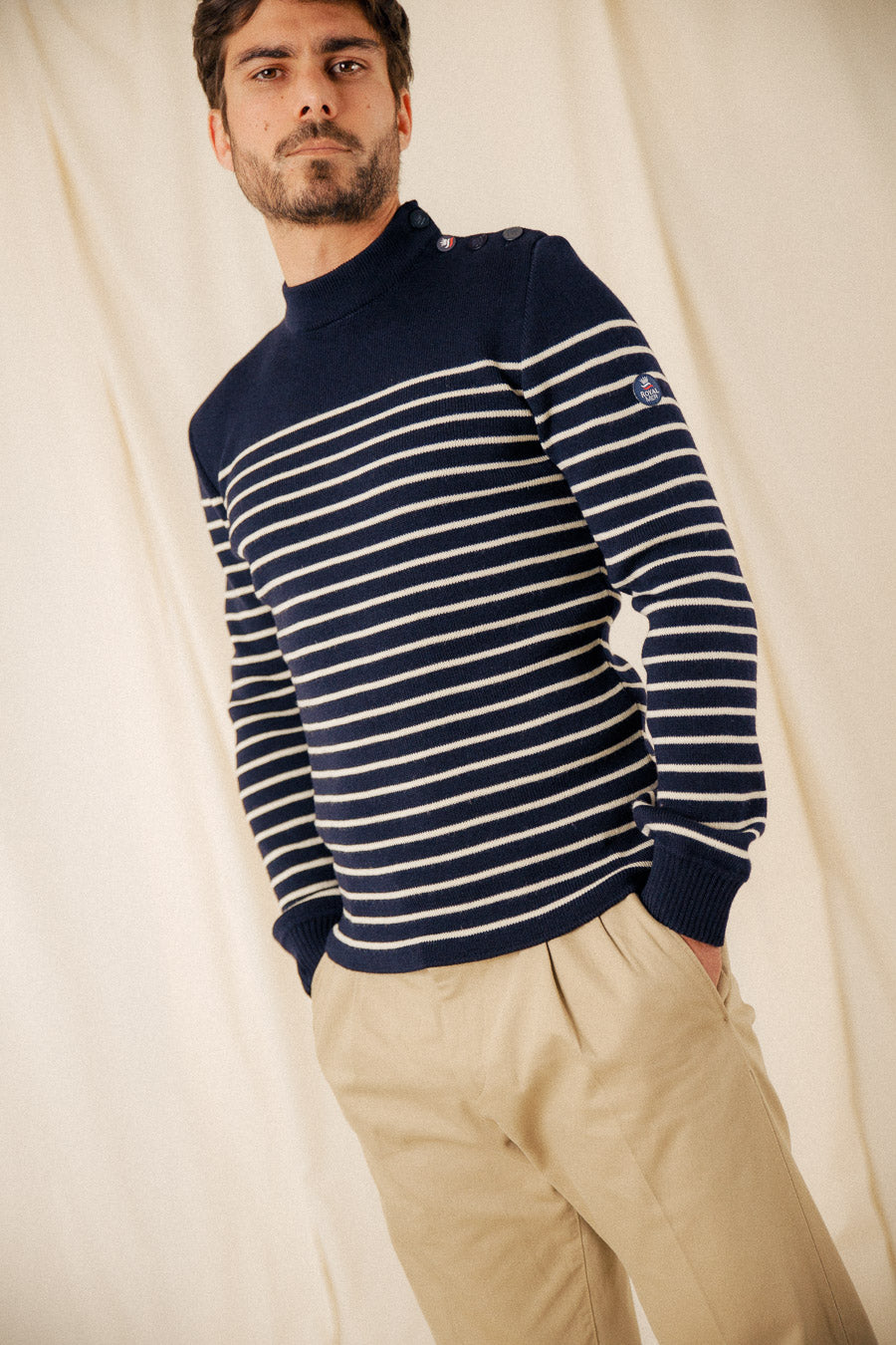 Le pull se distingue par son motif de rayures horizontales alternant entre une teinte bleu marine et des rayures blanches, offrant un look à la fois classique et intemporel. Son col montant peut être replié, ajoutant une touche de sophistication à votre tenue. De plus, les 3 boutons laqués sur l'épaule renforcent son style nautique, tandis qu'un logo distinctif sur la manche souligne l'authenticité de ce vêtement.