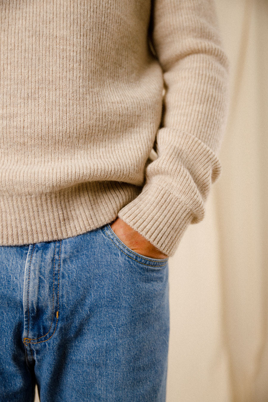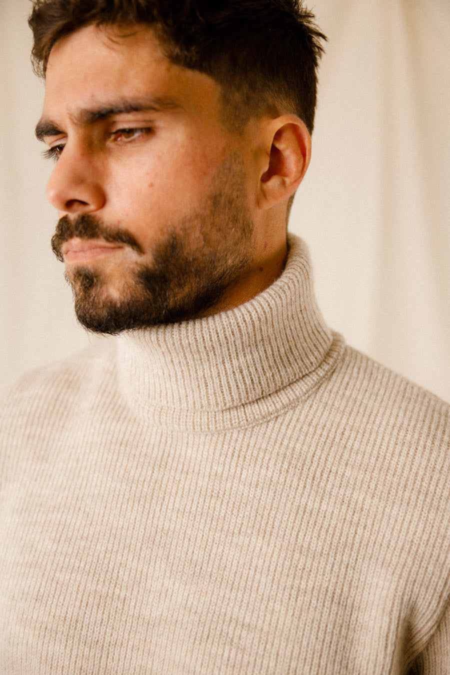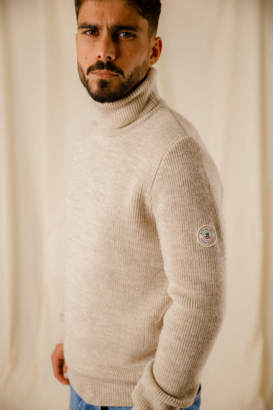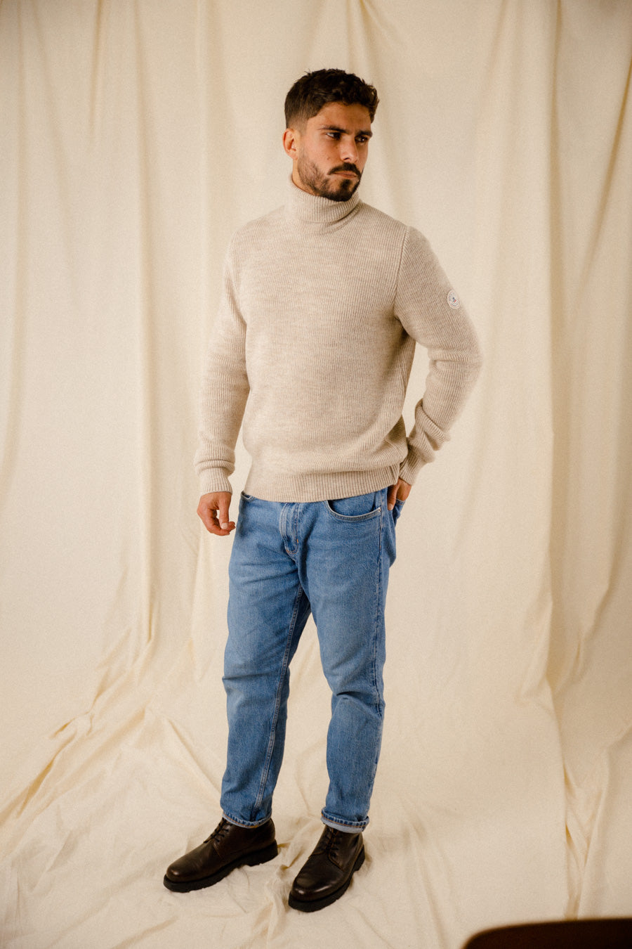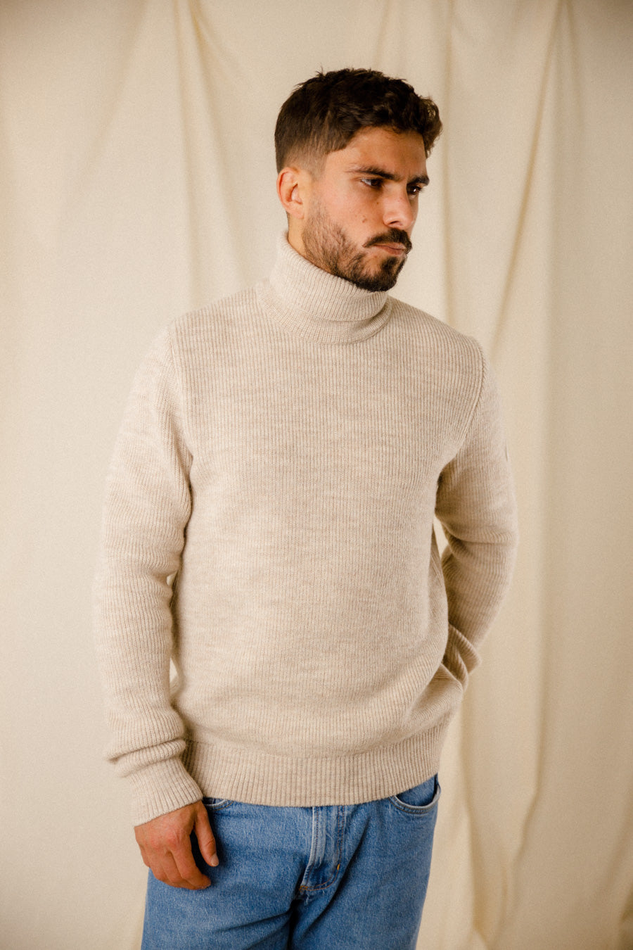 Le pull col roulé Vadim est un vêtement incontournable pour les saisons fraîches, alliant élégance et confort. Conçu en 100% laine vierge lavée, ce pull beige clair présente une texture légèrement chinée qui lui confère une allure chaleureuse et sophistiquée.