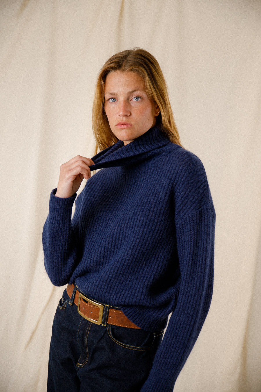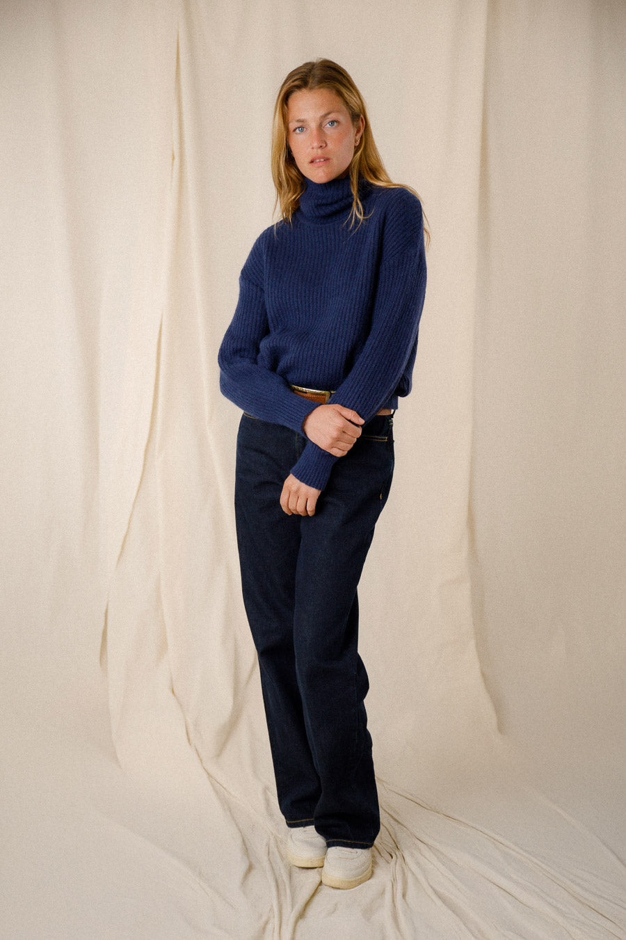 Le pull présente une coupe ample avec des manches légèrement larges, offrant un style décontracté et confortable. Le col roulé ajoute une touche de sophistication tout en protégeant contre le froid. Sa couleur marine élégante s'associe facilement à d'autres vêtements, ce qui en fait un incontournable de votre garde-robe.