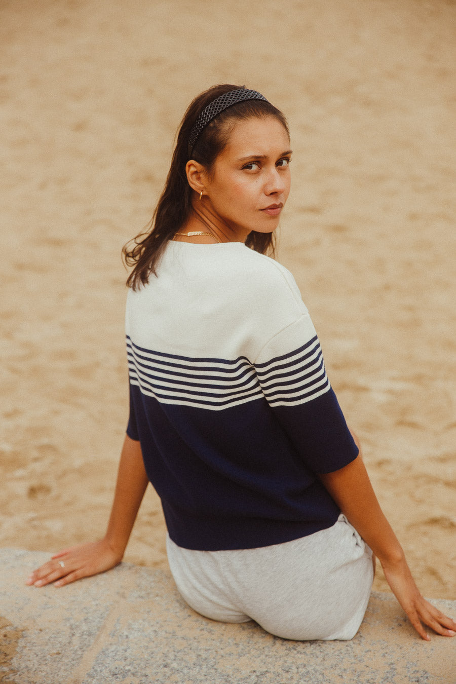 Le design est accentué par des rayures horizontales qui ajoutent une dimension dynamique à l'ensemble. Que ce soit pour une journée ensoleillée ou une soirée fraîche, ce pull s'adapte parfaitement à toutes les occasions. Vous pouvez le porter avec un short, un jean ou même une jupe pour un look polyvalent et chic.