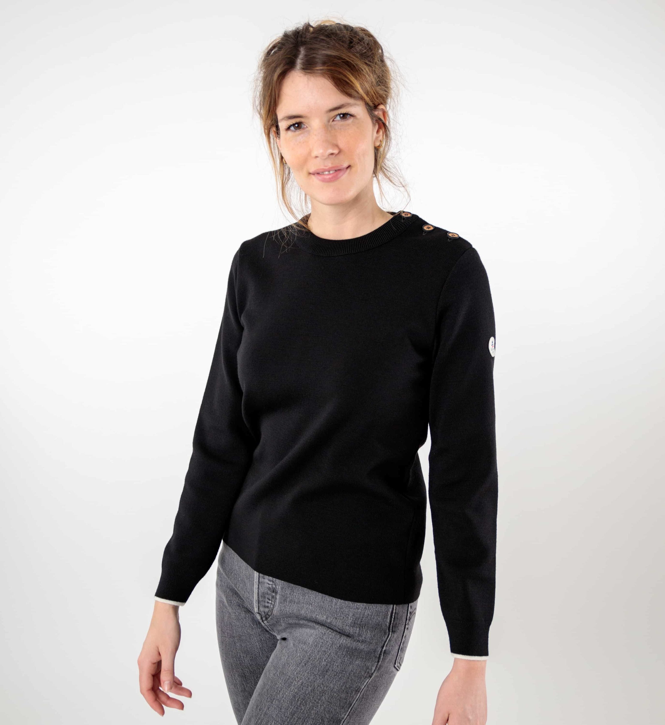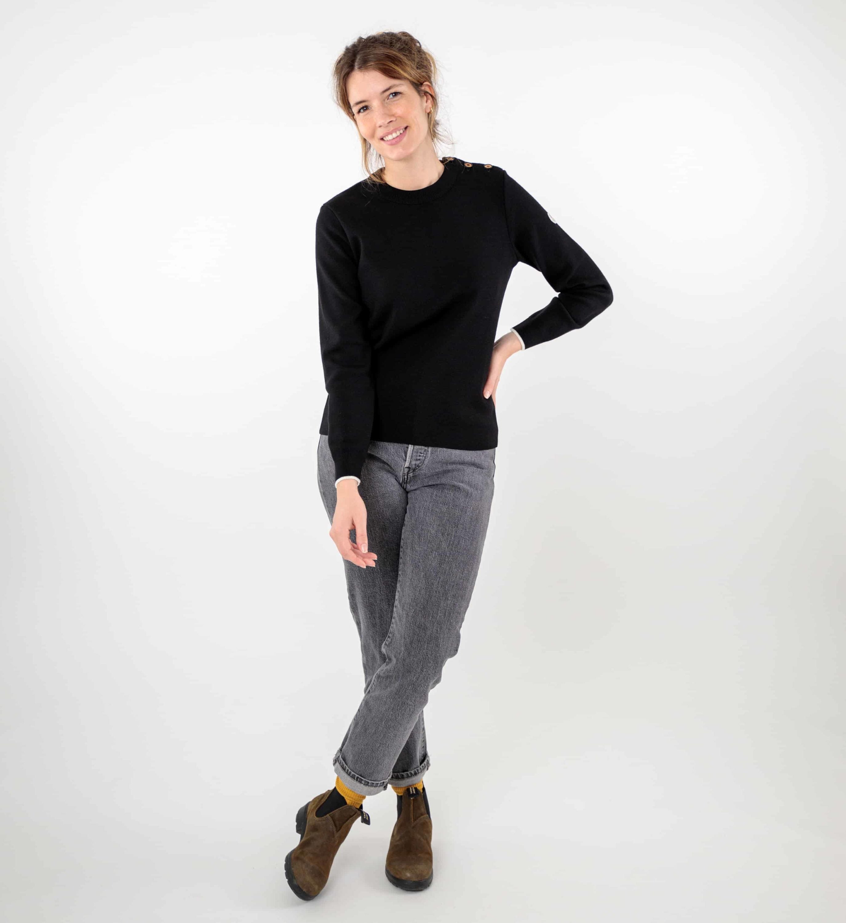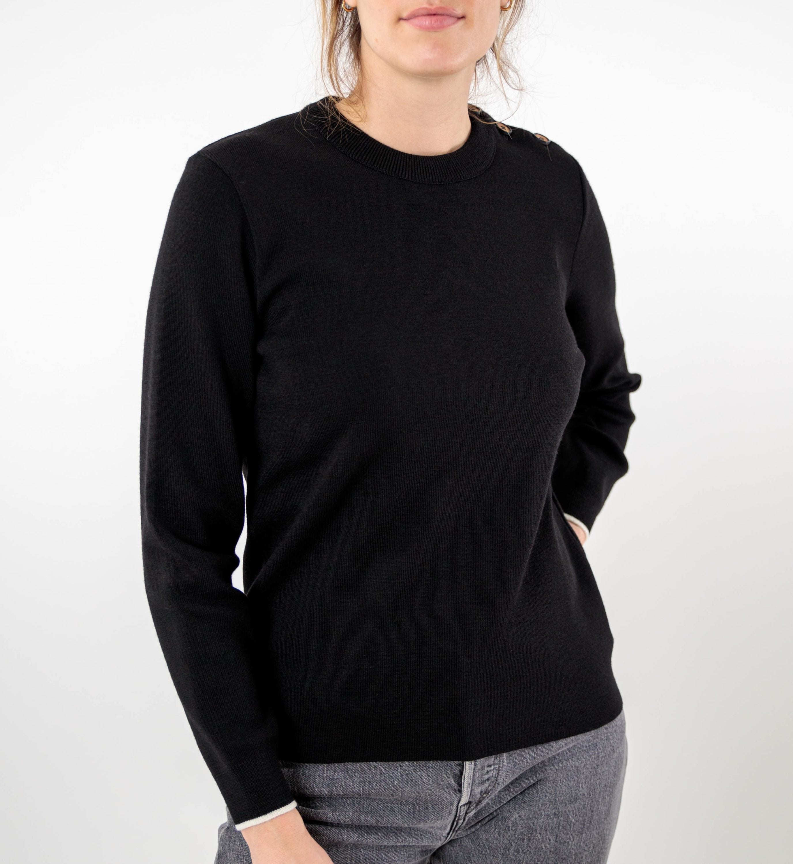 Plongez dans l’élégance intemporelle du style marin avec notre Pull Liza uni en noir. Arborant une encolure ronde classique, ce pull incarne l’essence même de la tradition maritime, tout en apportant une touche moderne. Le boutonnage subtilement placé sur l’épaule gauche, agrémenté de boutons en bois à la tranche colorée, transporte instantanément votre esprit vers les horizons marins. Chaque détail, des bords-côtes aux bas des manches, rehaussés d’un liseré contrasté, à la finition soignée au bas du corps, témoigne d’une attention particulière aux détails. Doté d’une maille côte 1/1, ce pull procure une sensation de chaleur naturelle et une douceur incomparable contre la peau. Composition : 100% laine mérinos fine