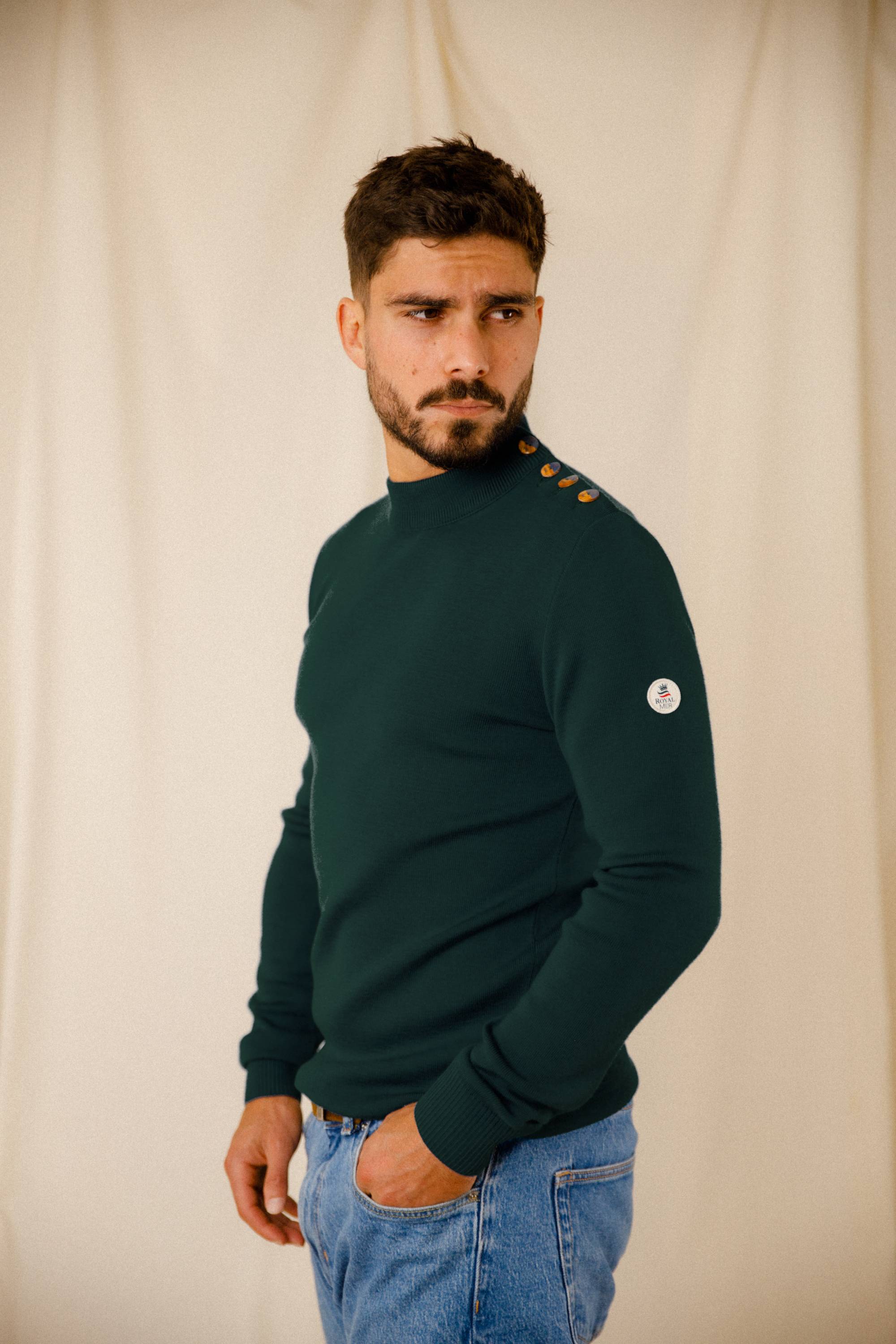 Le pull marin Marceau est un incontournable pour les amateurs de mode masculine. Confectionné en 100 % laine mérinos fine, ce pull de couleur vert foncé allie confort et élégance, parfait pour les saisons fraîches.