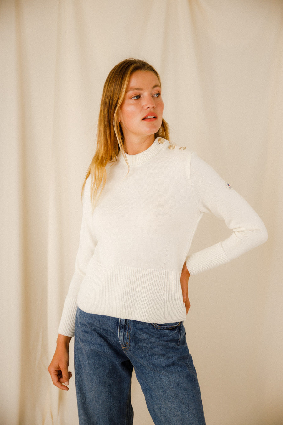 Ce modèle se distingue par son encolure ronde agrémentée de boutons décoratifs sur l'épaule, ajoutant une note de style unique. Sa coupe ajustée met en valeur la silhouette tout en offrant une liberté de mouvement appréciable. Le tricotage en maille jersey assure une texture agréable au toucher, tandis que les manches longues et légèrement évasées au niveau des poignets apportent une touche de modernité.