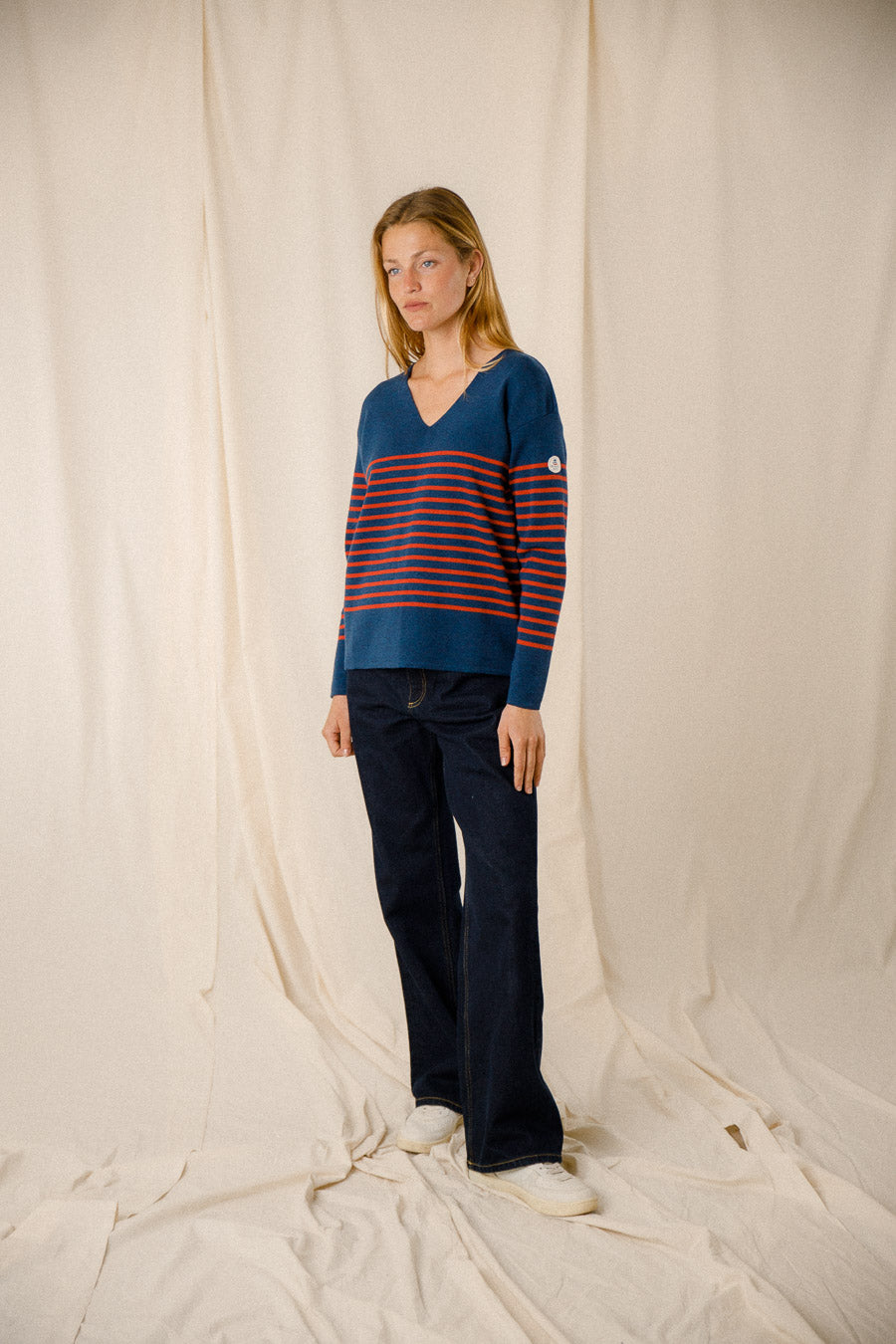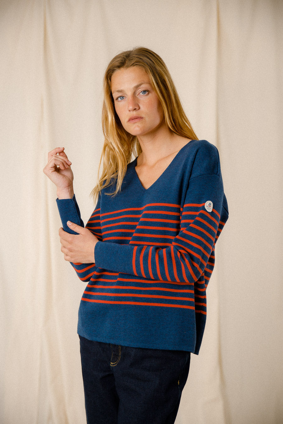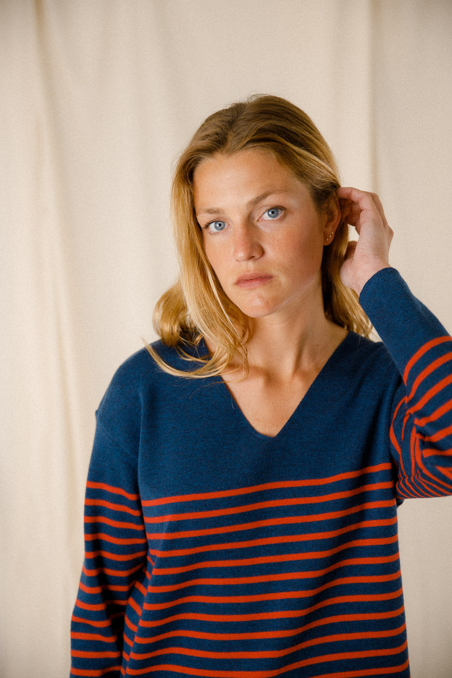 Plongez dans l'élégance intemporelle avec notre pull Laetitia bleu chiné et vitamine conçu en 100% laine mérinos fine.