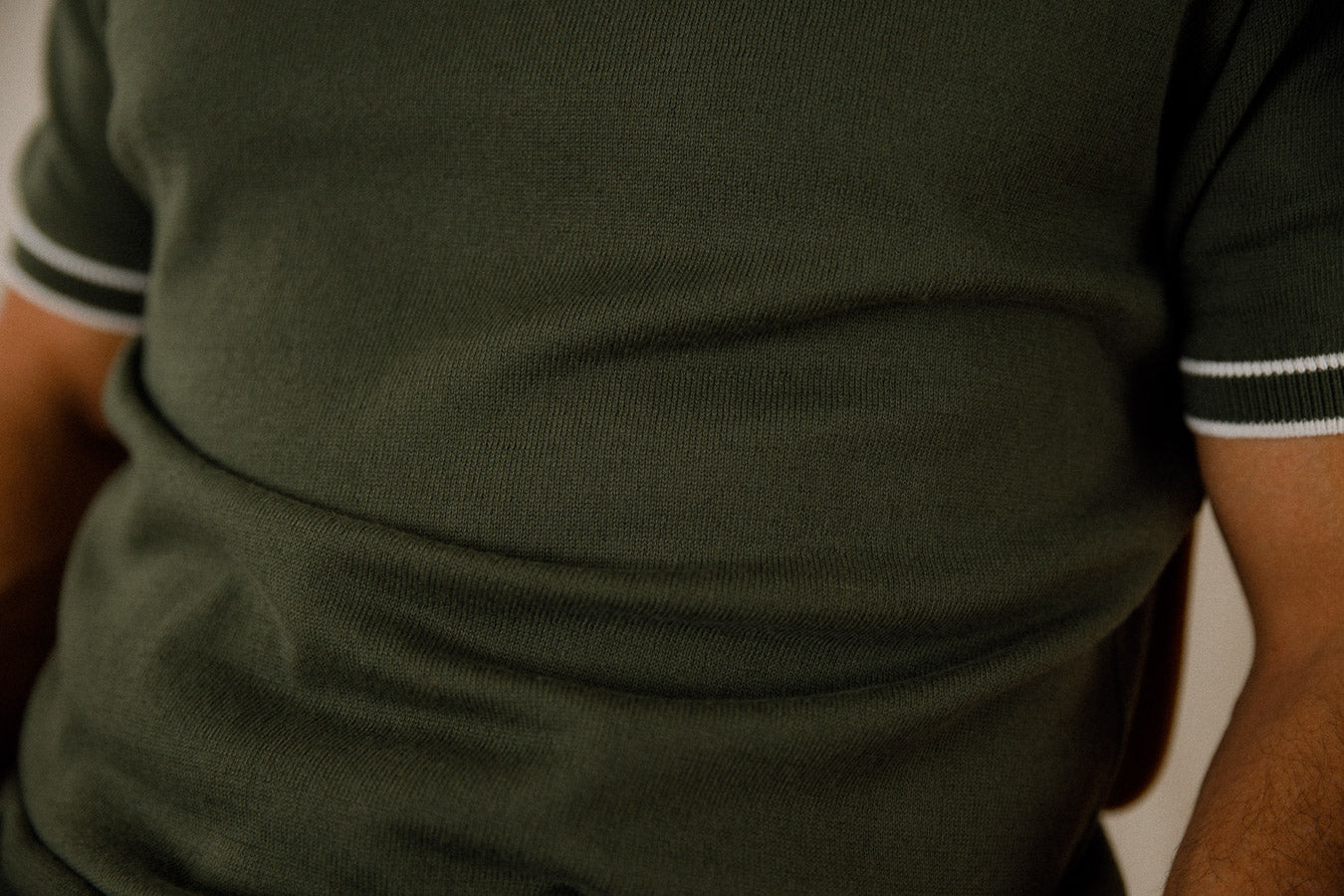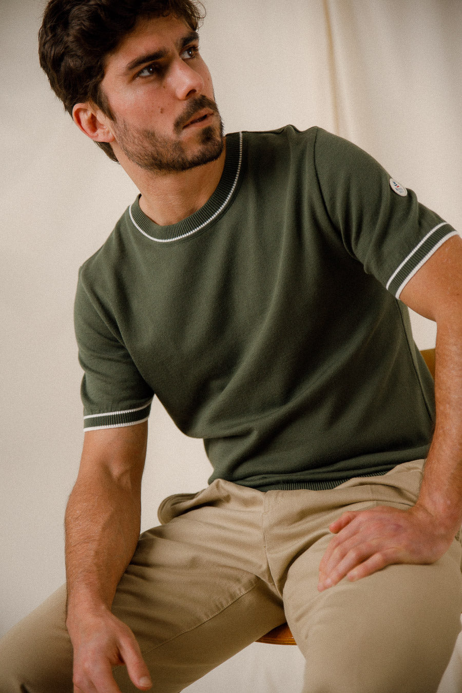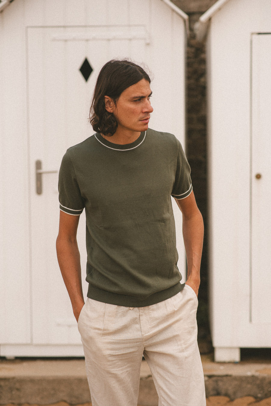 Tee-shirt Aristide en coton égyptien, alliant confort et élégance. Ce modèle se distingue par sa couleur kaki avec des finitions en craie, offrant une esthétique naturelle et sophistiquée.
