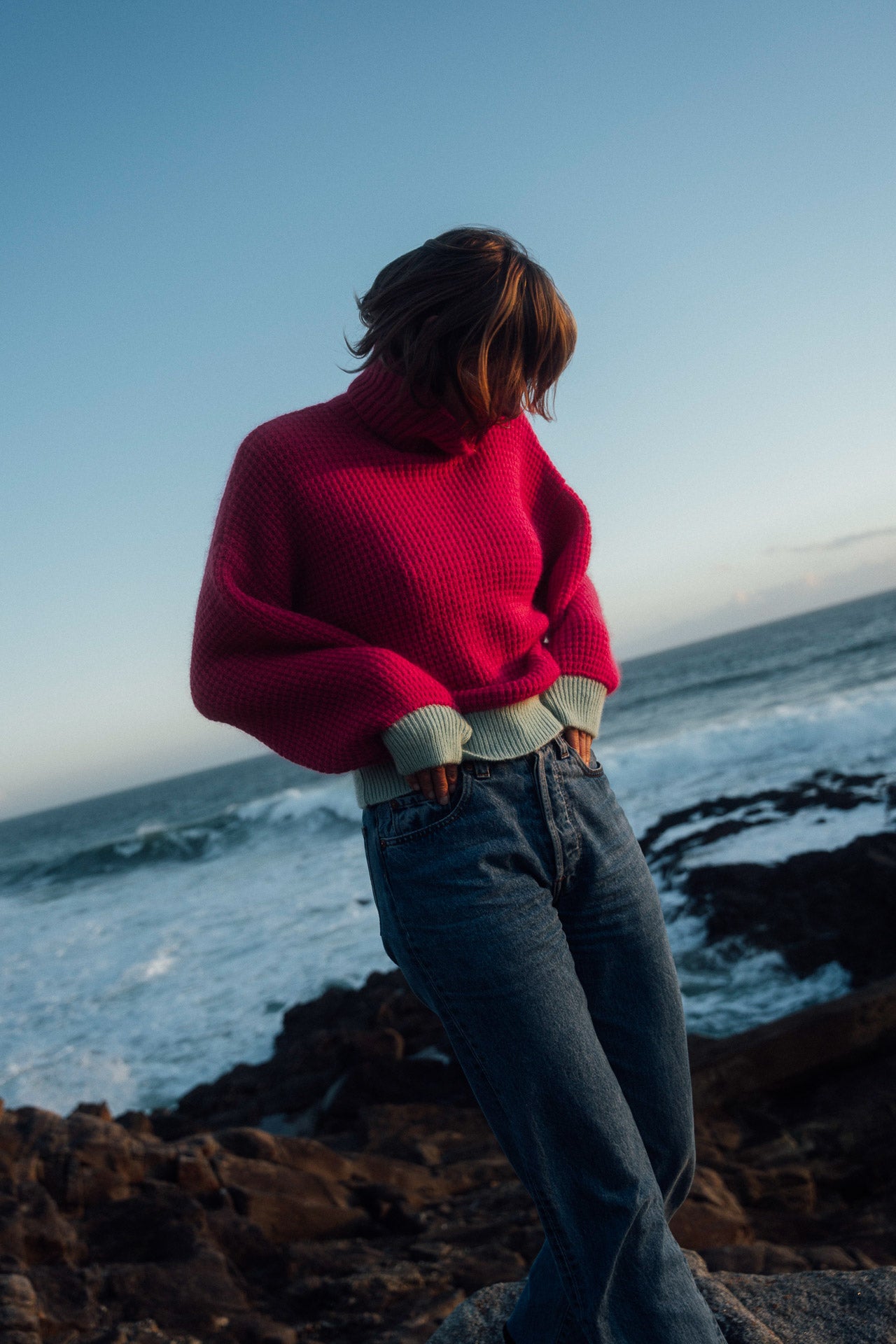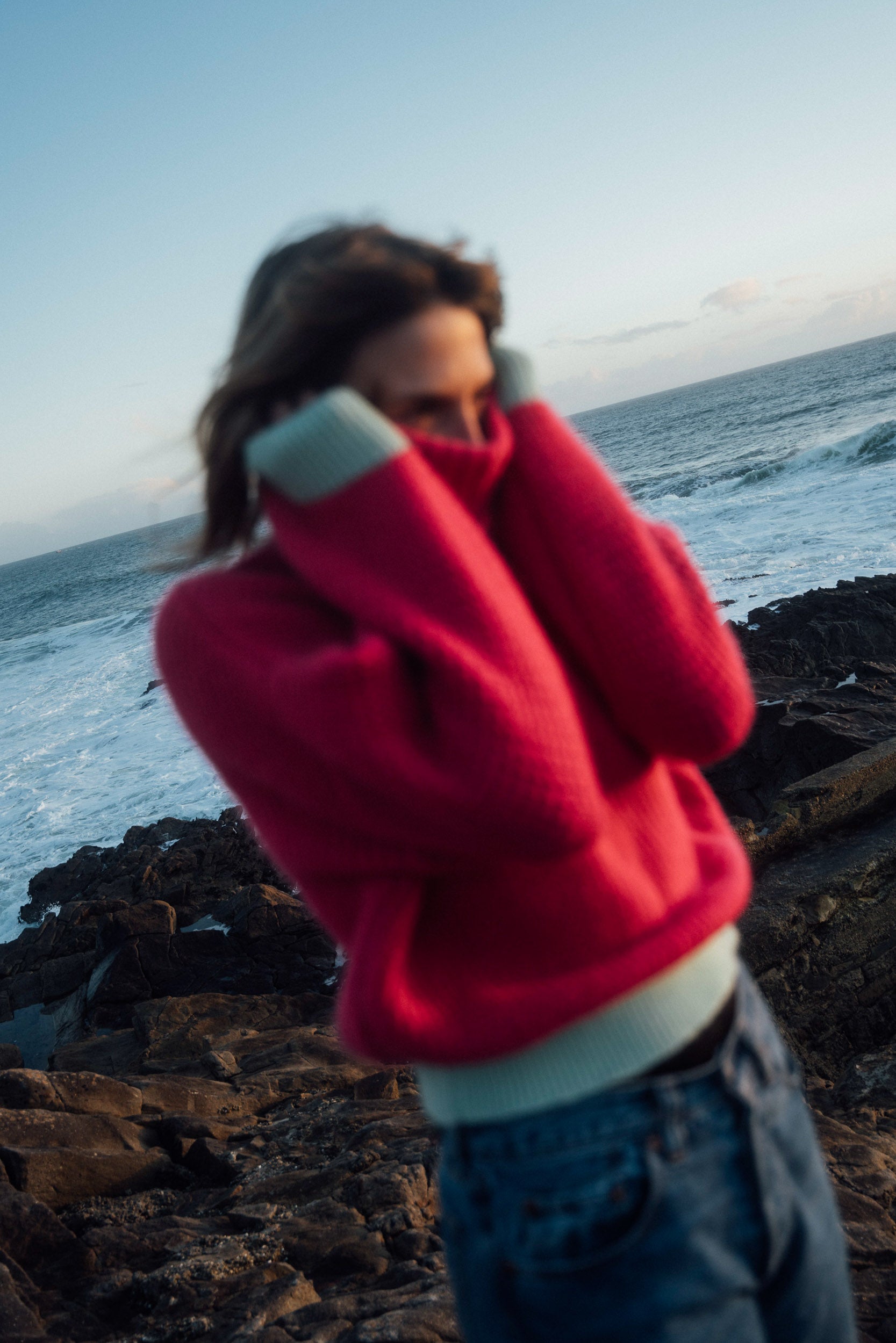 Its loose, relaxed fit , with long sleeves that gather at the wrists, ensures optimal comfort. The high turtleneck keeps your neck warm while adding a stylish touch to your look. Contrasting mint green ribbed trim at the cuffs and hem creates a beautiful visual harmony.
