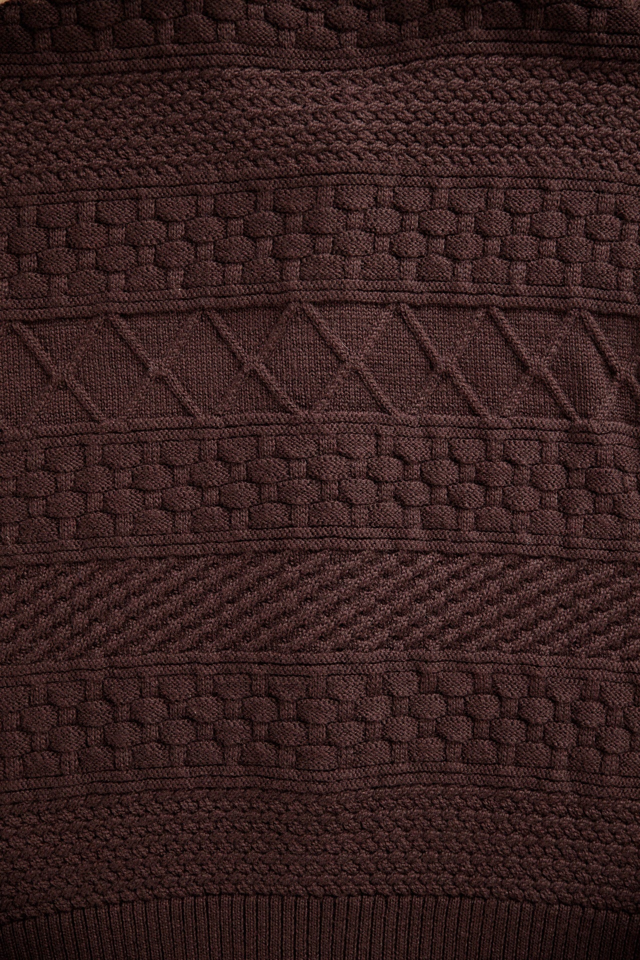 With its round neckline and comfortable fit, this cardigan stands out for its rich texture and fancy knit patterns inspired by the 90s. The knit features a raised pattern that adds an interesting visual dimension to the whole vest.