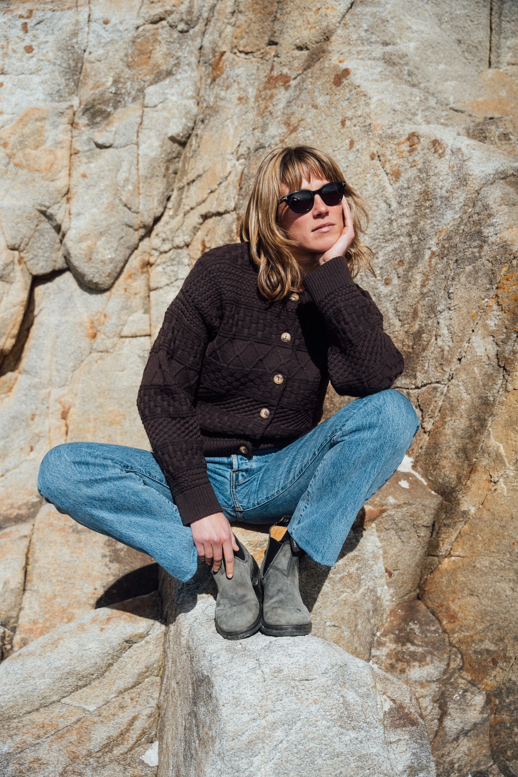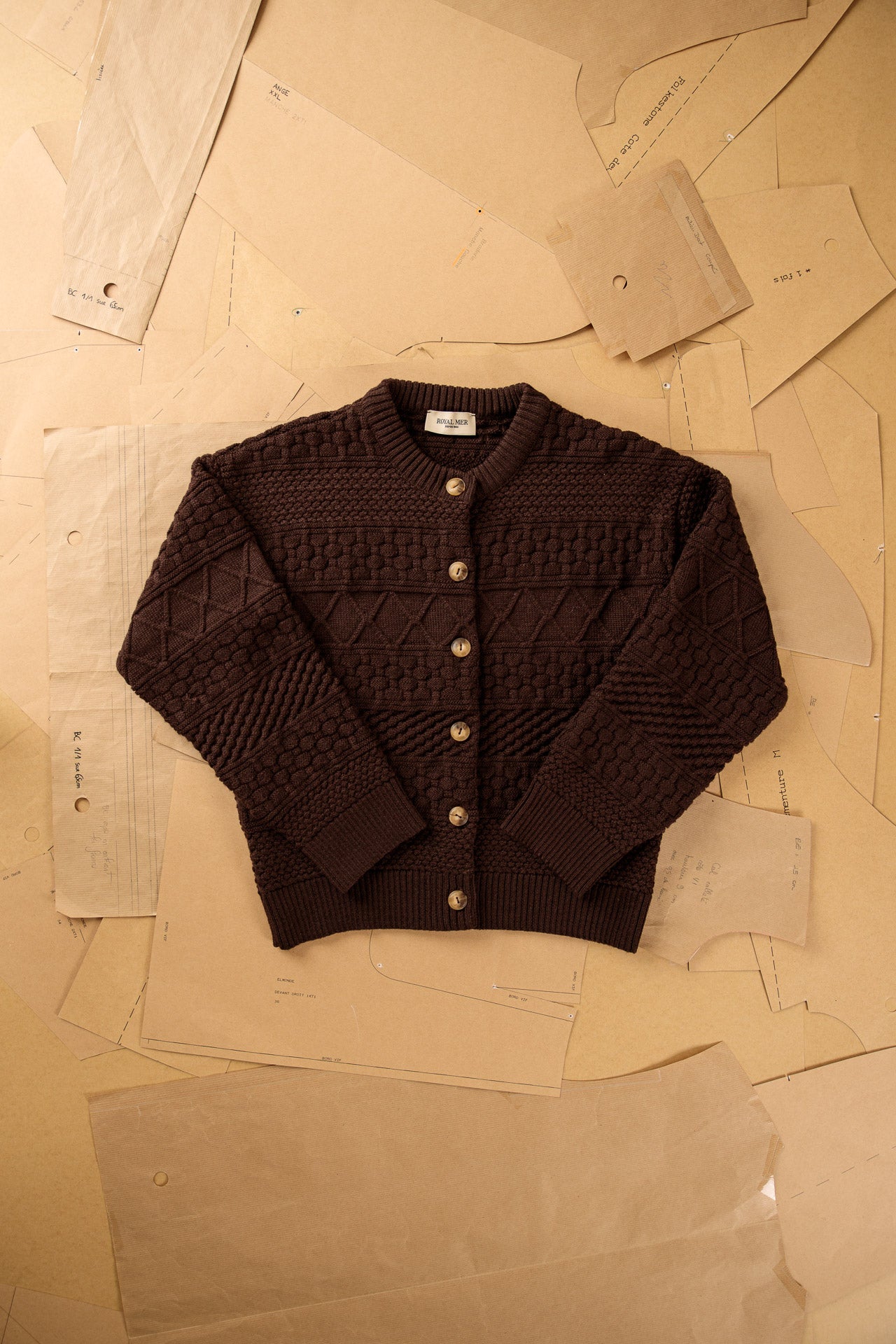 The Etel Cardigan is a must-have for women seeking comfort and elegance. This dark brown button-front cardigan is made from 100% virgin wool , offering warmth and softness for cooler days.