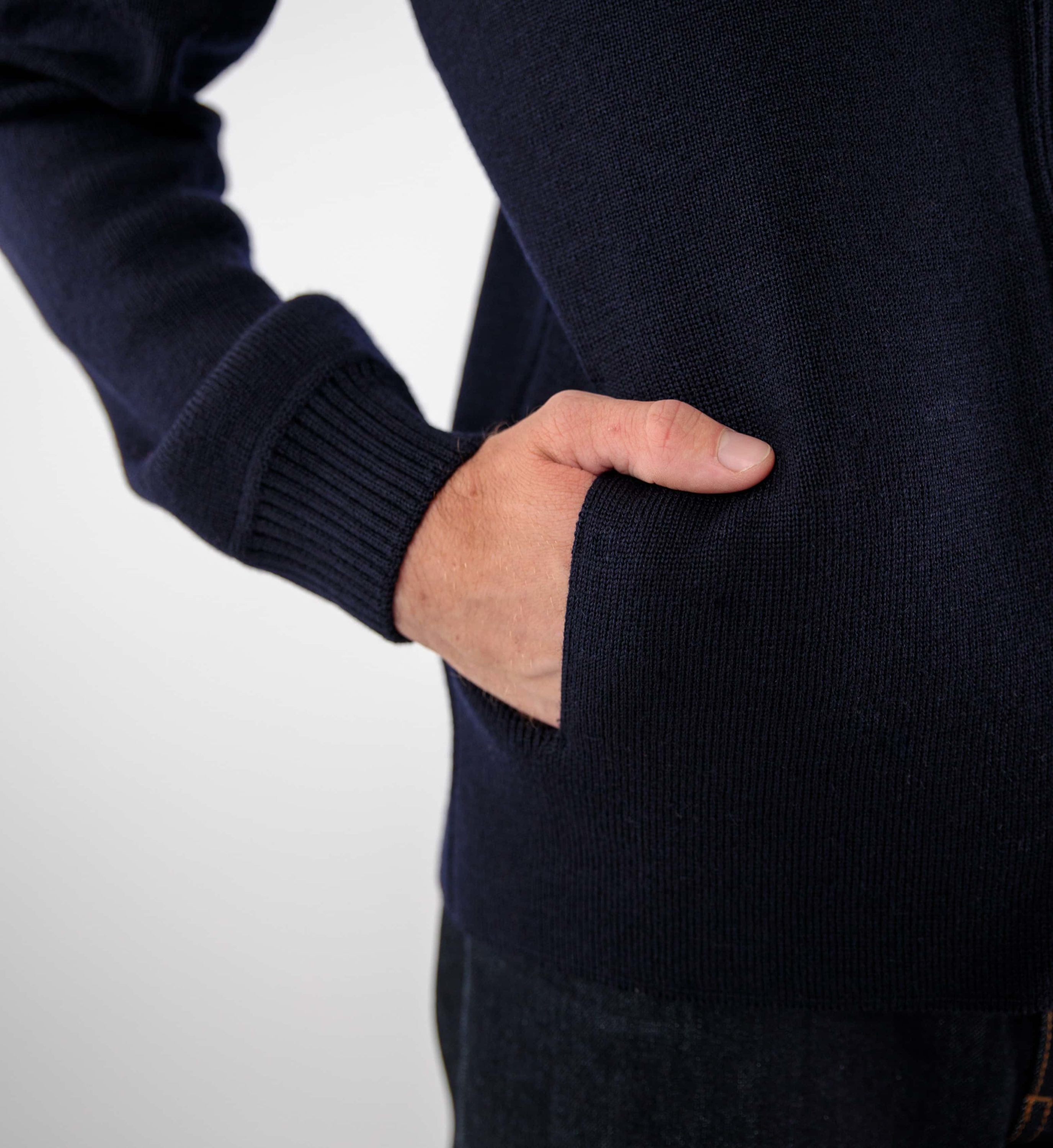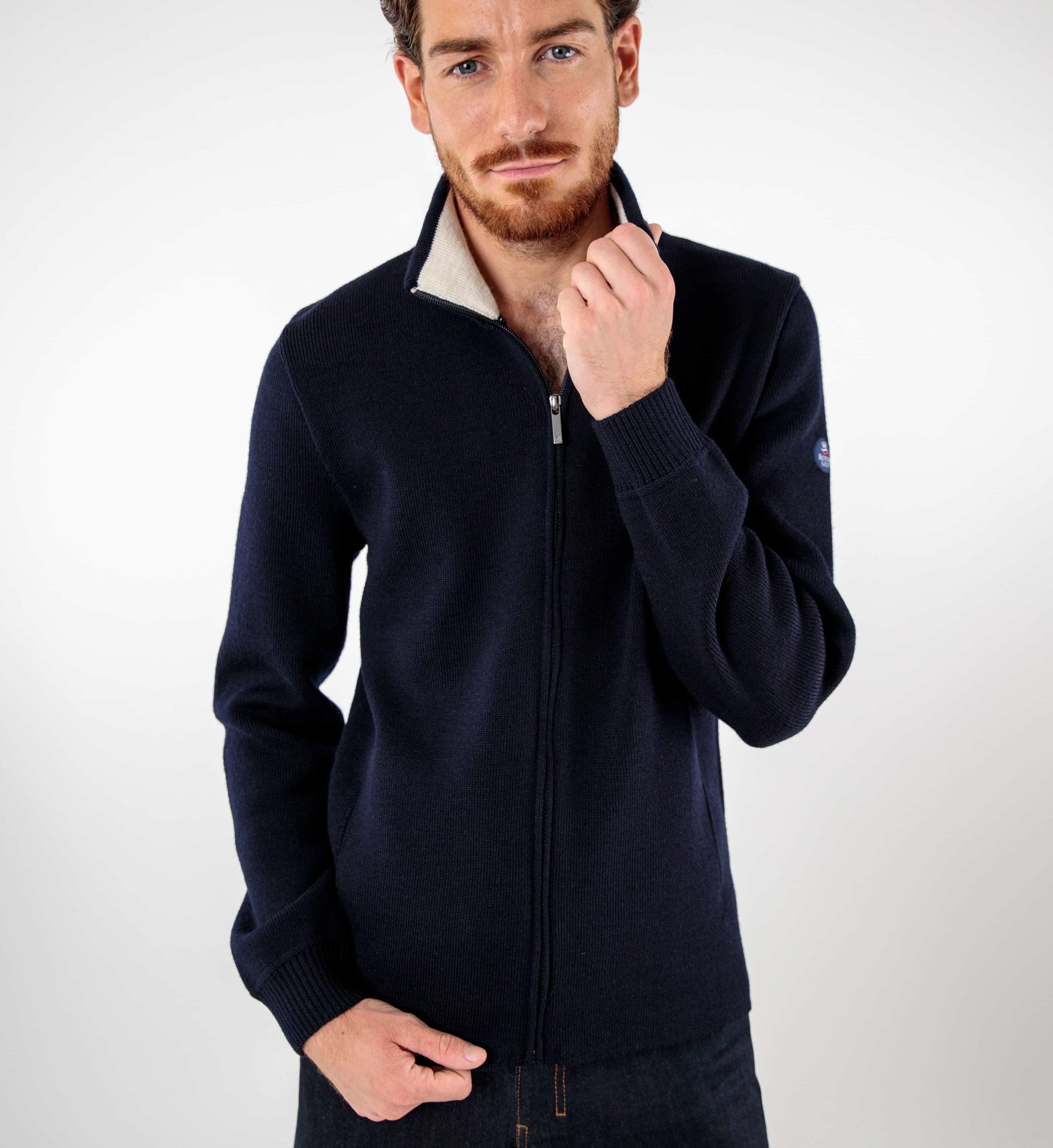 The Alberic U zip-up jacket in navy blue is a wardrobe essential. Made from 100% virgin wool , it embodies the quality and durability of a classic Breton sweater, while offering a stylish and modern look.