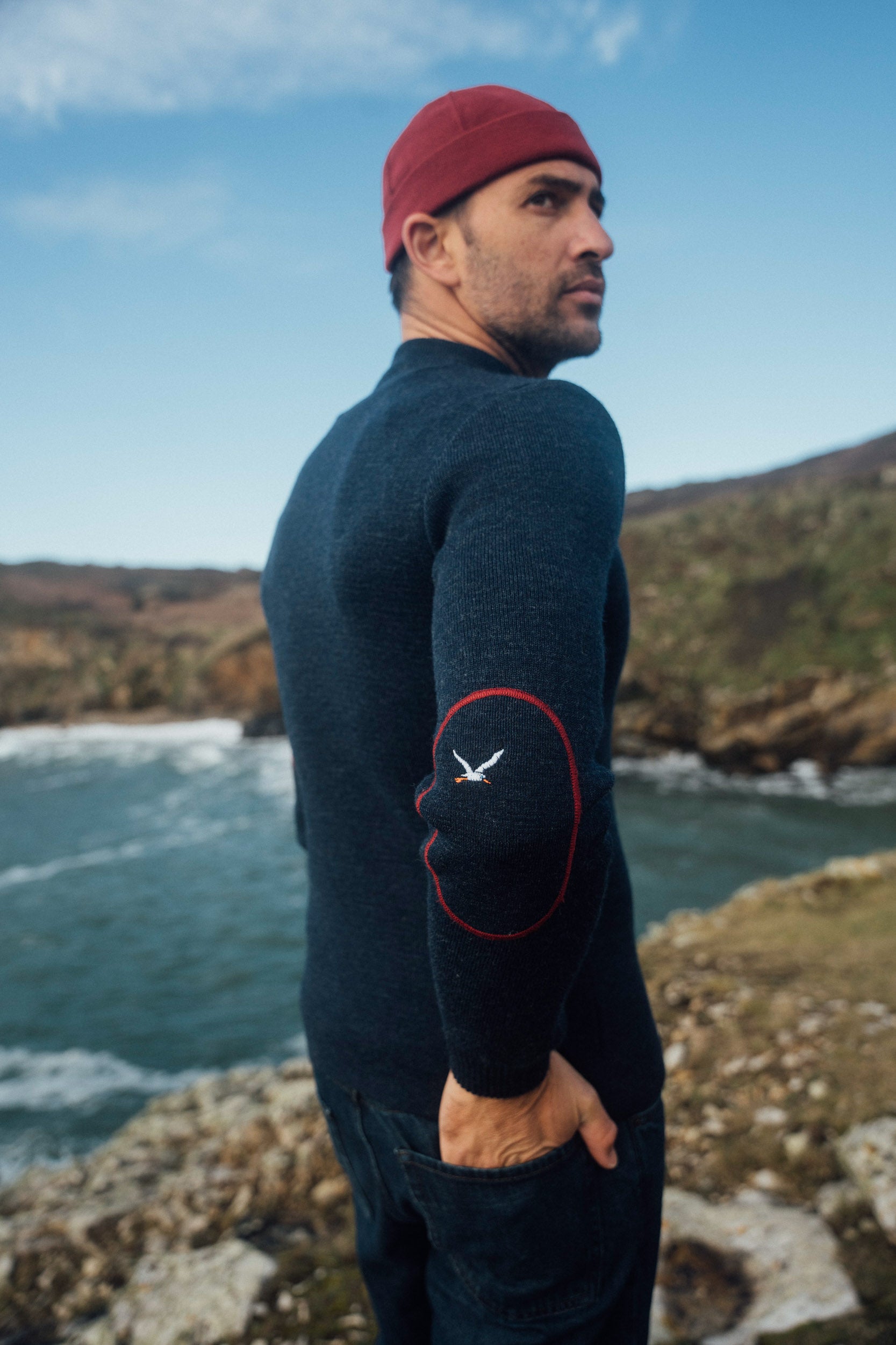 The Loum Breton sweater is a must-have for those seeking a piece that combines elegance and comfort. Made from 100% virgin wool , this sweater stands out with its heathered blue hue, enhanced by elbow patches adorned with seagull motifs that add a unique touch.