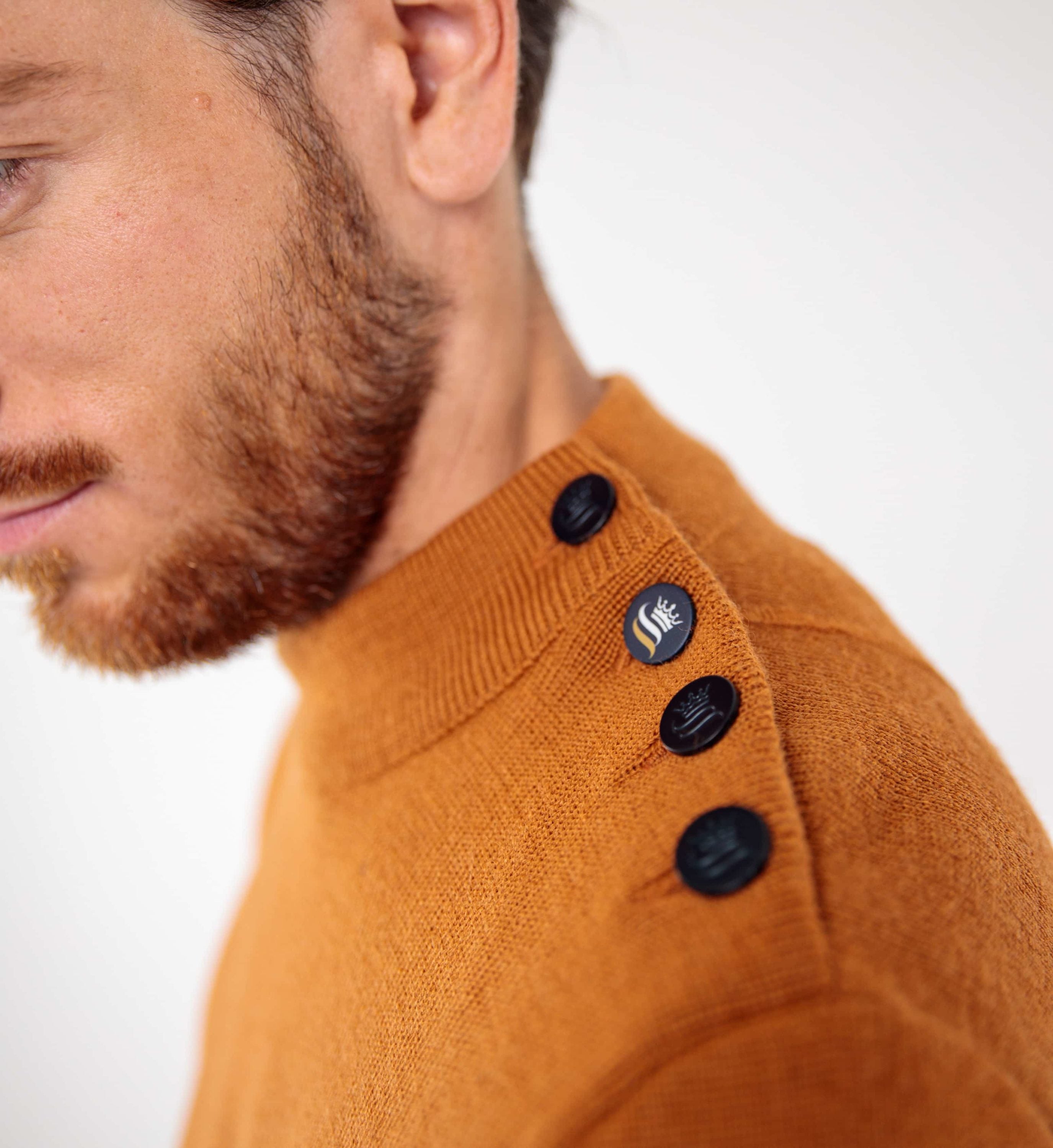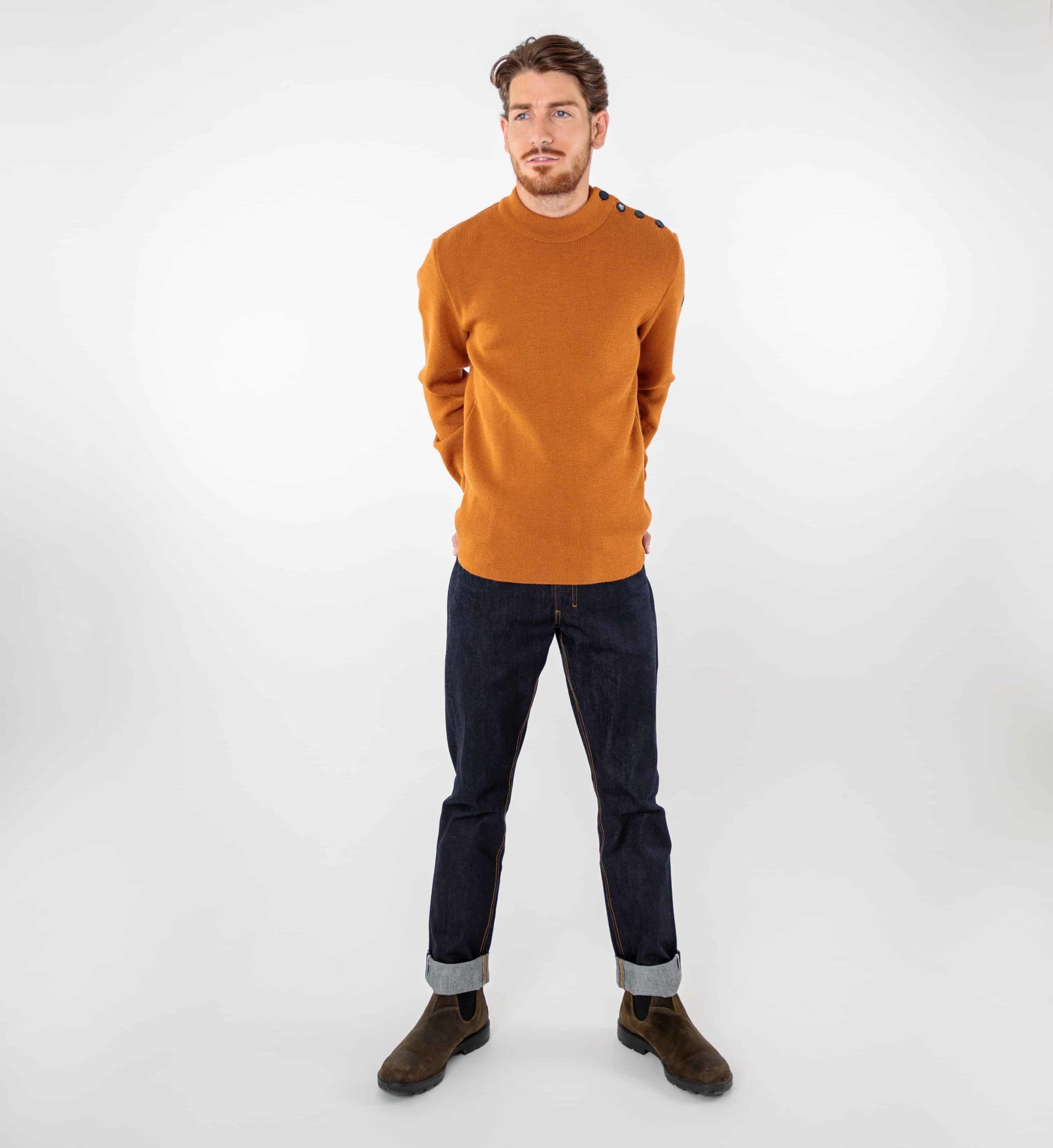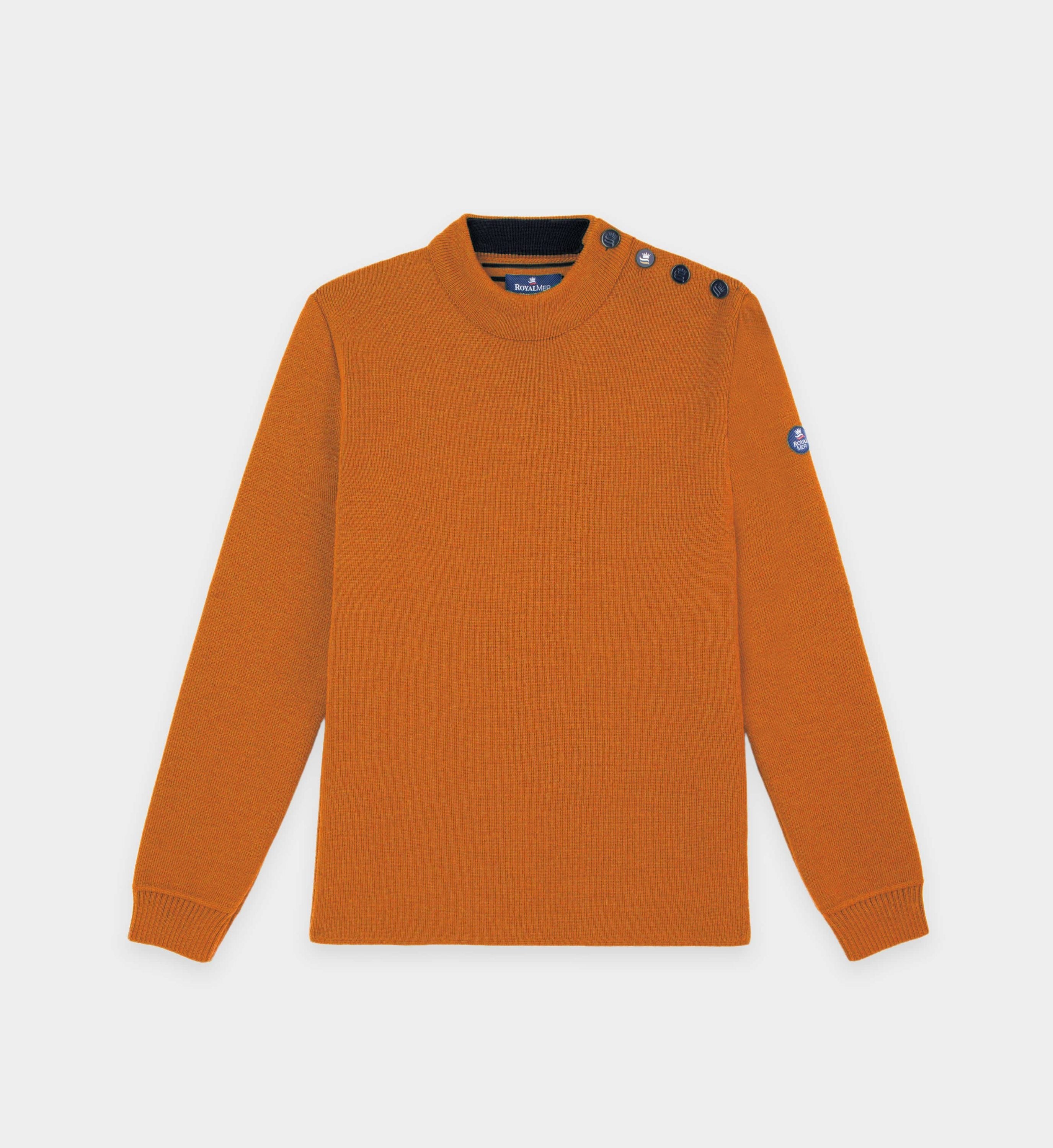 Ce pull se distingue par son col montant élégant avec un intérieur contrasté, offrant un look raffiné. Le boutonnage sur l’épaule gauche ajoute une note de tradition marine, tandis que les boutons mats marins complètent parfaitement l’esthétique globale.