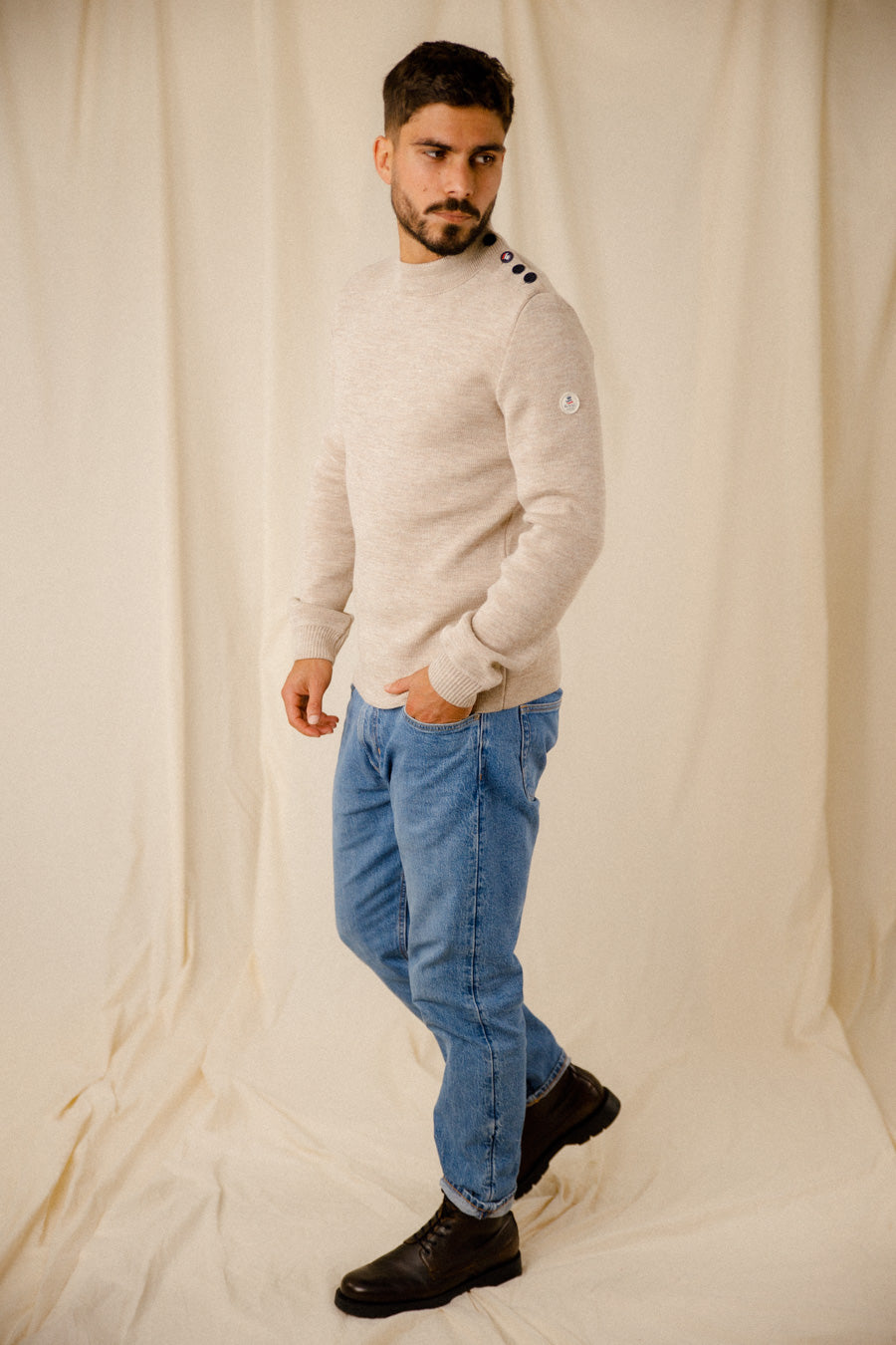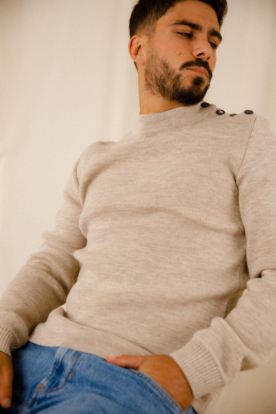 Le pull Adrian est également doté de détails raffinés, tels que des boutons aux épaules, qui ajoutent une touche distinctive inspirée du style marin. Ce vêtement est idéal pour un look décontracté mais soigné, pouvant être associé à un jean pour une sortie informelle ou à un pantalon habillé pour une occasion semi-formelle.