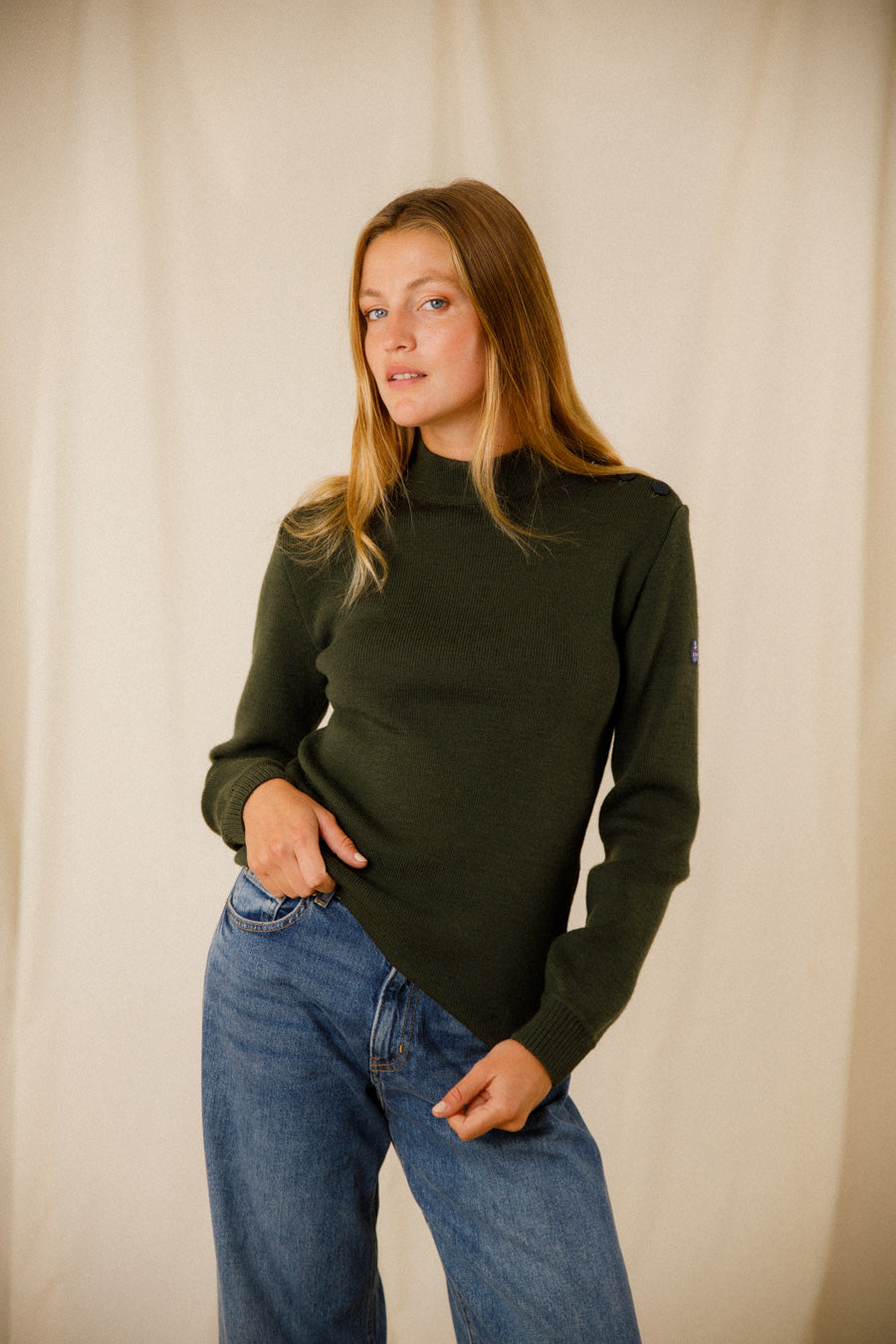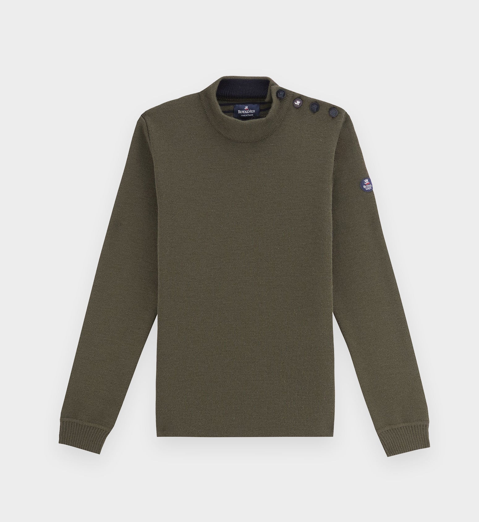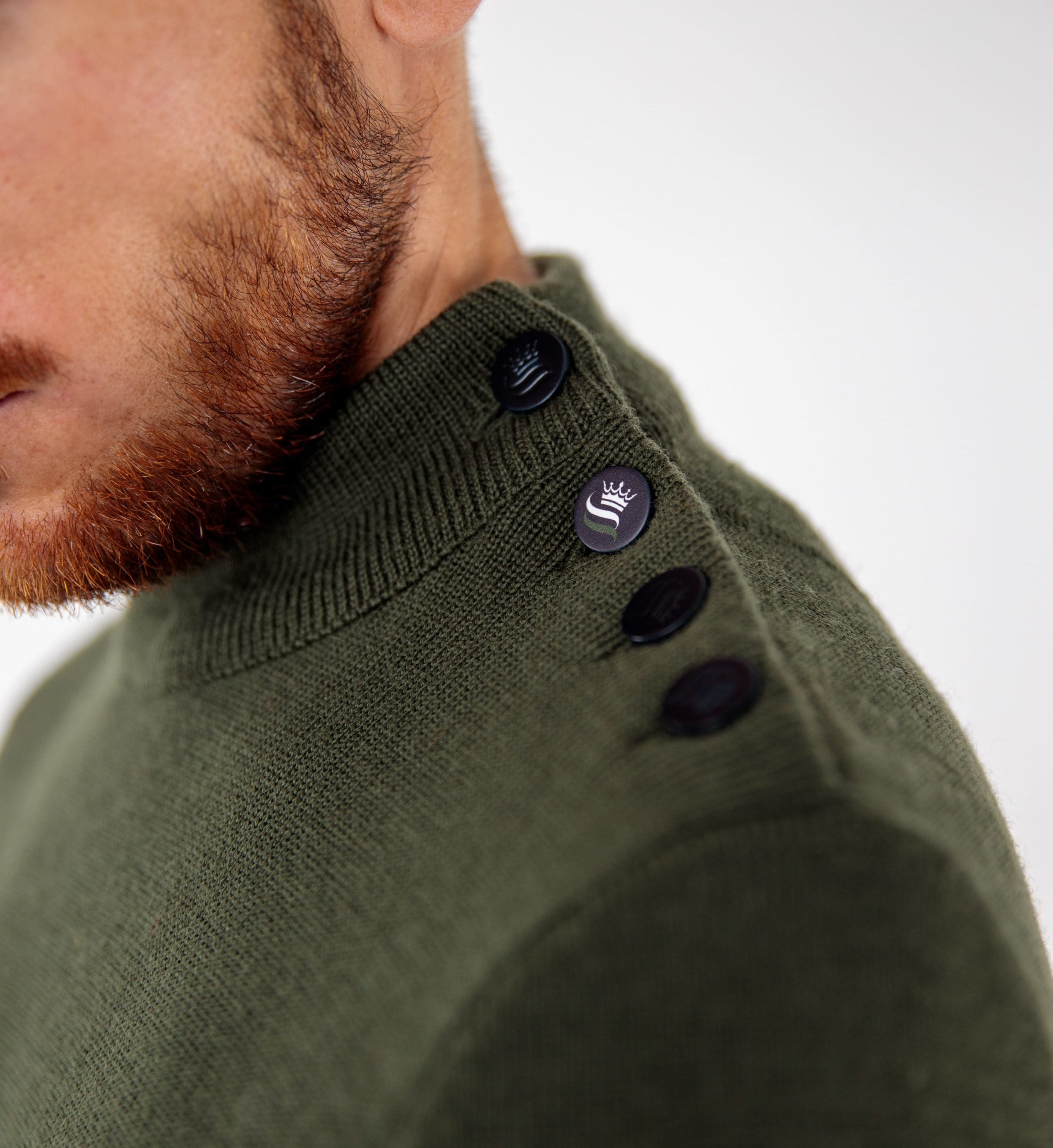 Le pull se distingue par son coloris vert olive uni qui évoque la nature et s'adapte facilement à divers styles. Les 3 boutons laqués de couleur marine, ainsi qu'un bouton assorti à la laine, ajoutent une touche d'élégance à ce vêtement décontracté.