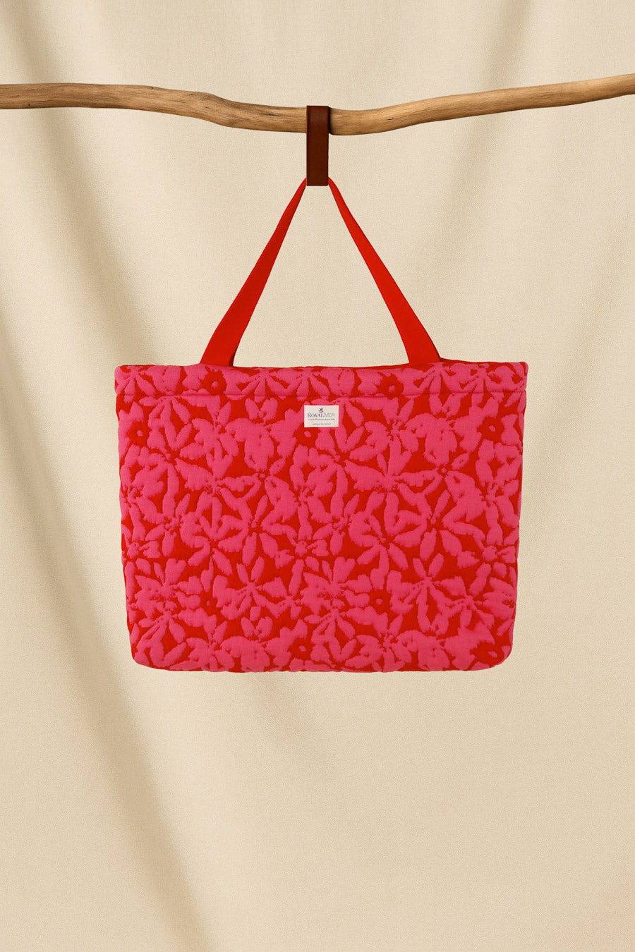 Grand cabas fleurs Gaby ROYAL MER est l'accessoire parfait pour allier style et praticité. Ce cabas, confectionné en 100% coton, se distingue par son motif floral vibrant en nuances de rouge et rose, apportant une touche de fraîcheur à votre garde-robe.