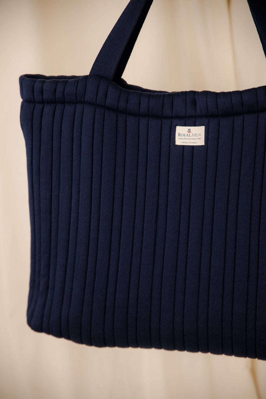 Le grand cabas rayé Gaby est un accessoire incontournable pour ceux qui recherchent à la fois style et praticité. Conçu en 100% coton, ce cabas arbore un motif de rayures verticales en bleu marine qui lui confère une allure élégante et intemporelle.