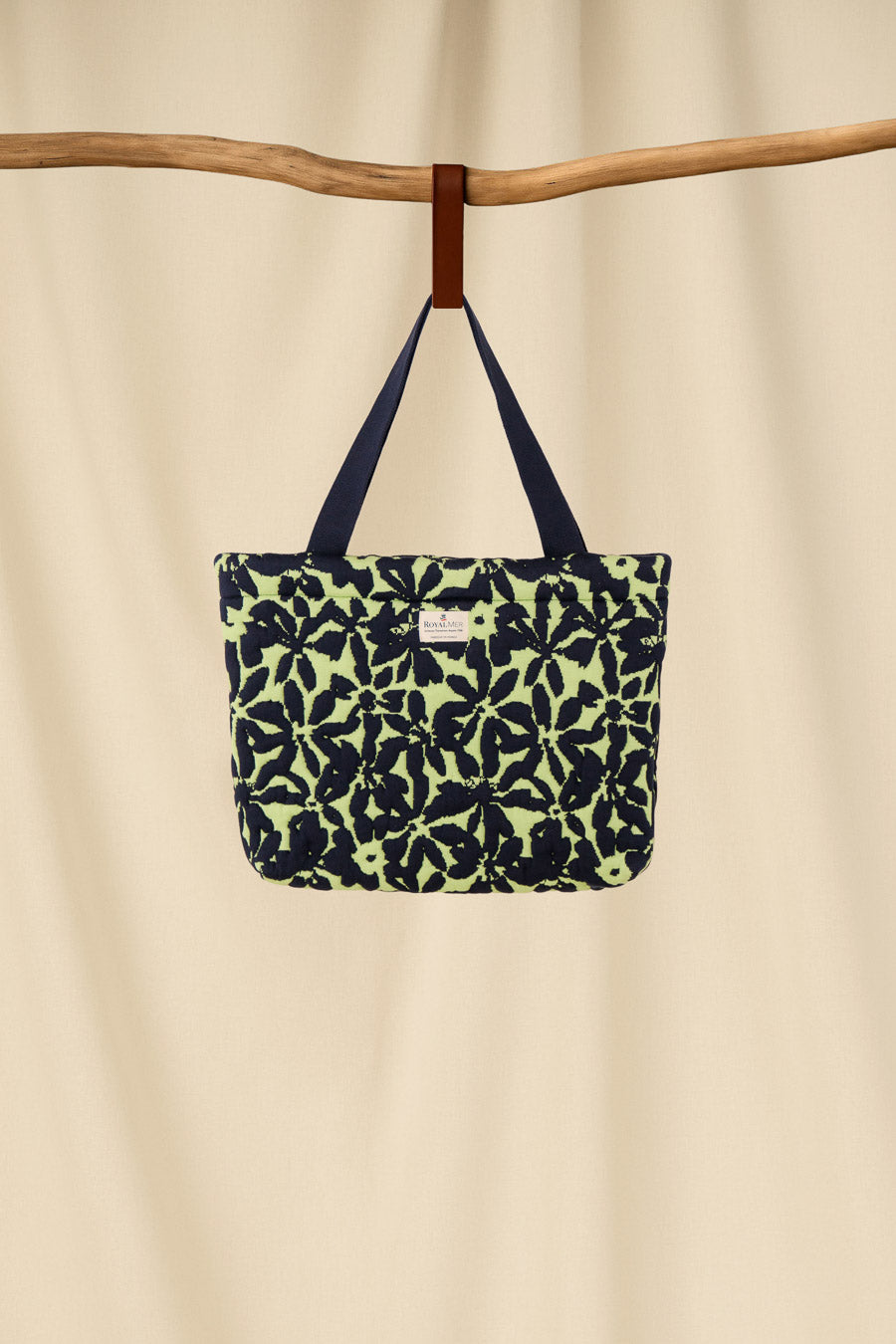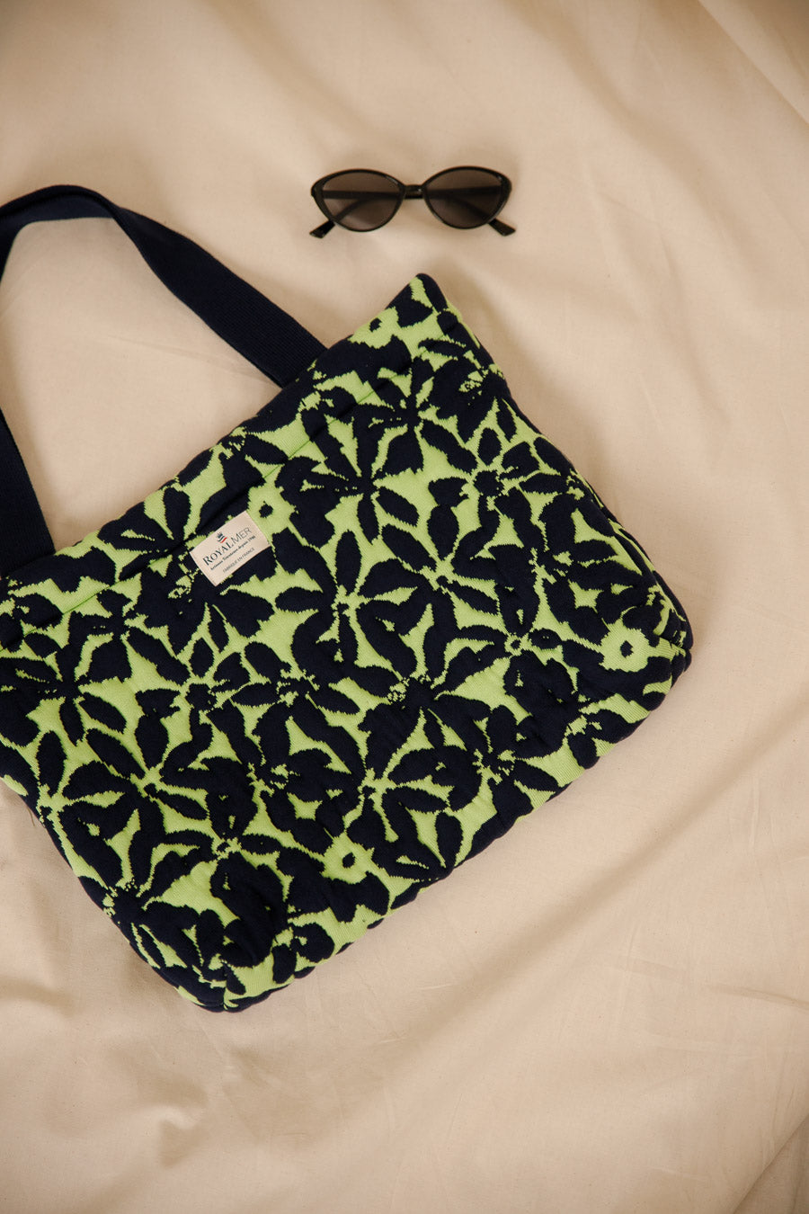 Le motif jacquard bicolore, avec des fleurs vert pastel sur un fond bleu marine, apporte une touche de fraîcheur et de modernité à votre look. Les anses en tissu bleu marine offrent une bonne prise en main et un confort optimal lors du transport.