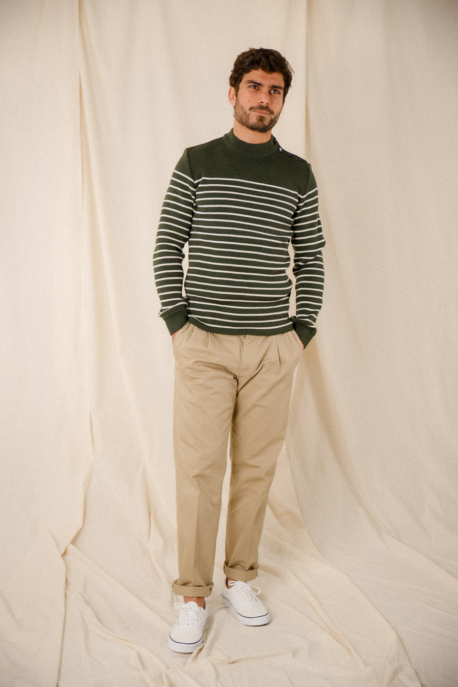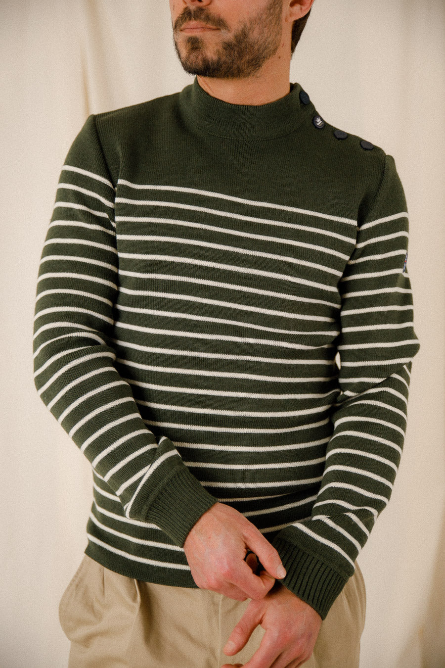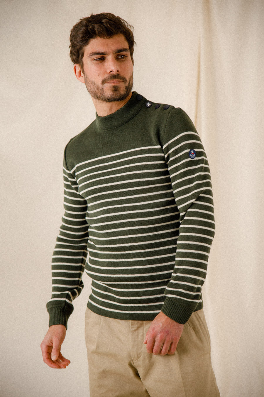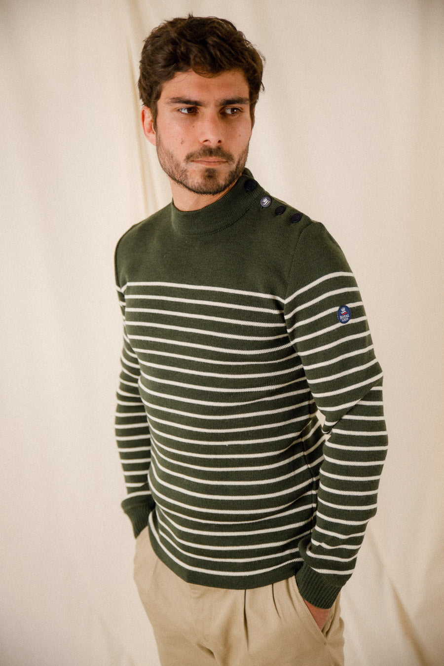 Mettez de la couleur dans votre garde-robe avec ce pull marin rayé confectionné en 100% laine vierge. Sa teinte cyprès écru, associée à des rayures blanches, lui confère un aspect marin traditionnel, parfait pour un style décontracté et élégant.