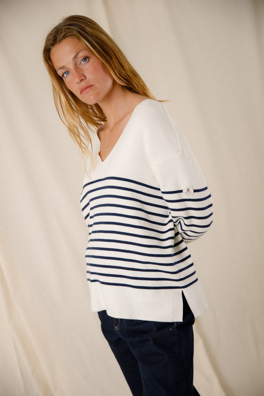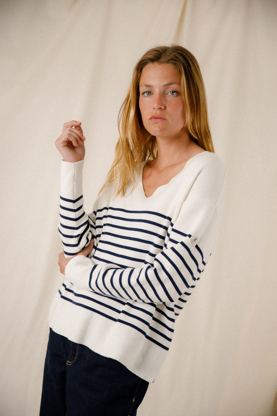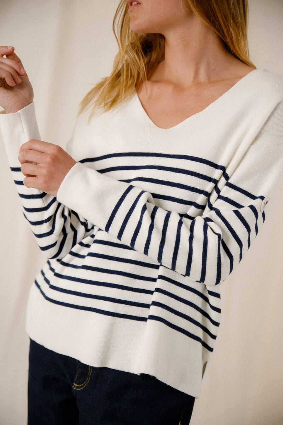 Craquez pour notre pull rayé bicolore Capucine à col V en écru et bleu marine, 100% coton Egyptien.