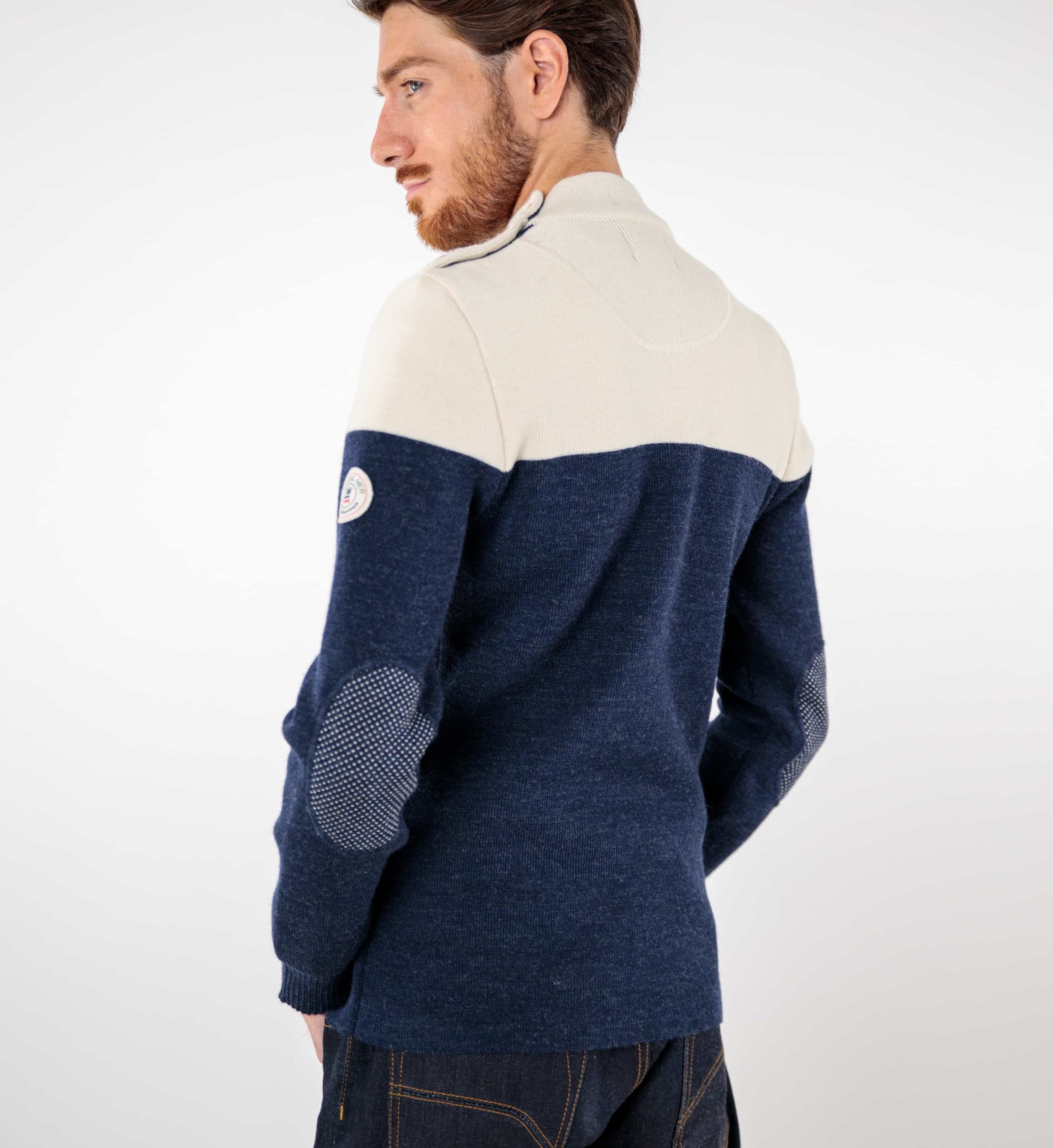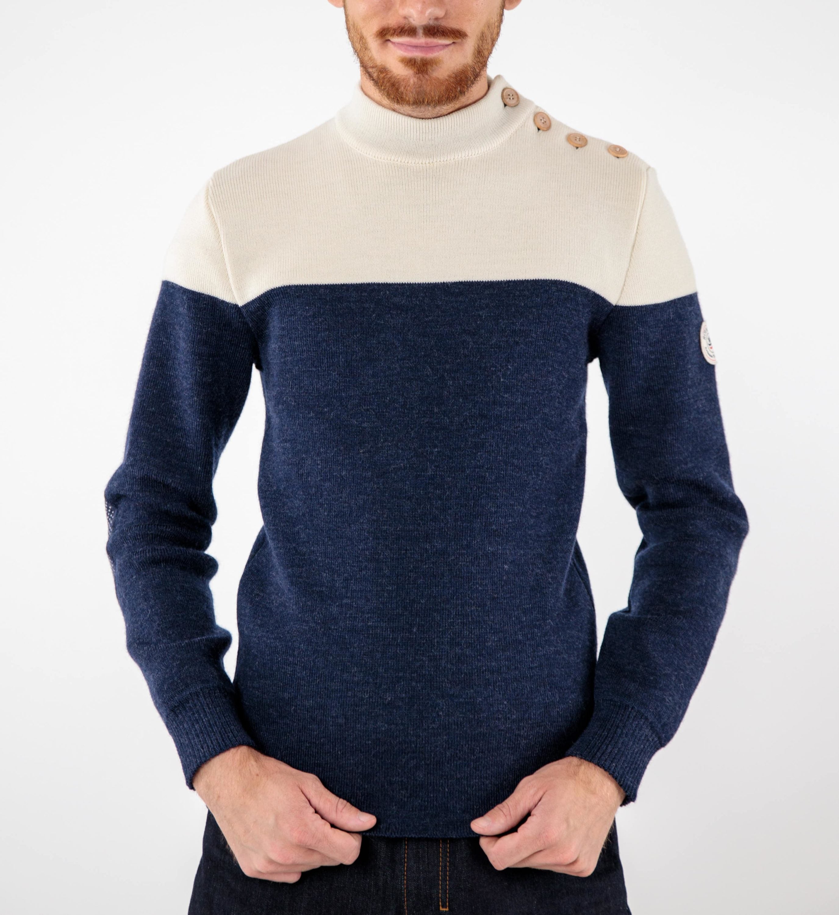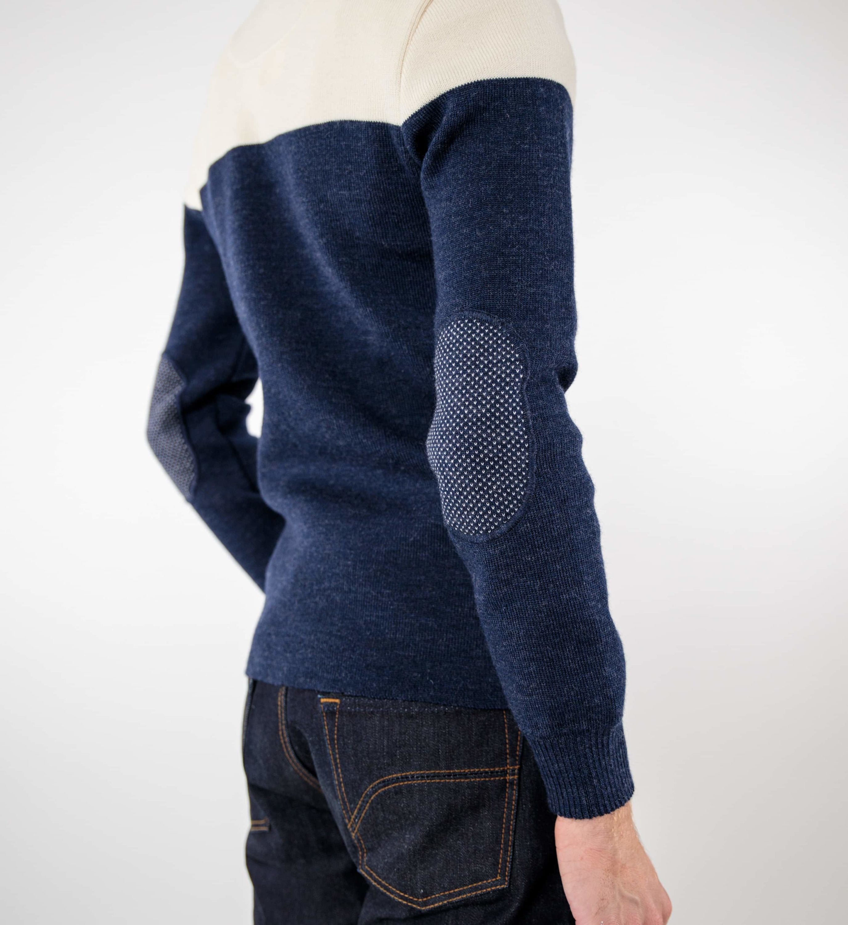Ce pull en côte 1/1 est une réinterprétation du traditionnel pull marin. On aime son style bicolore et ses coudières fantaisies. Le pull Roland est fabriqué en France dans notre atelier à la Regrippière (44).