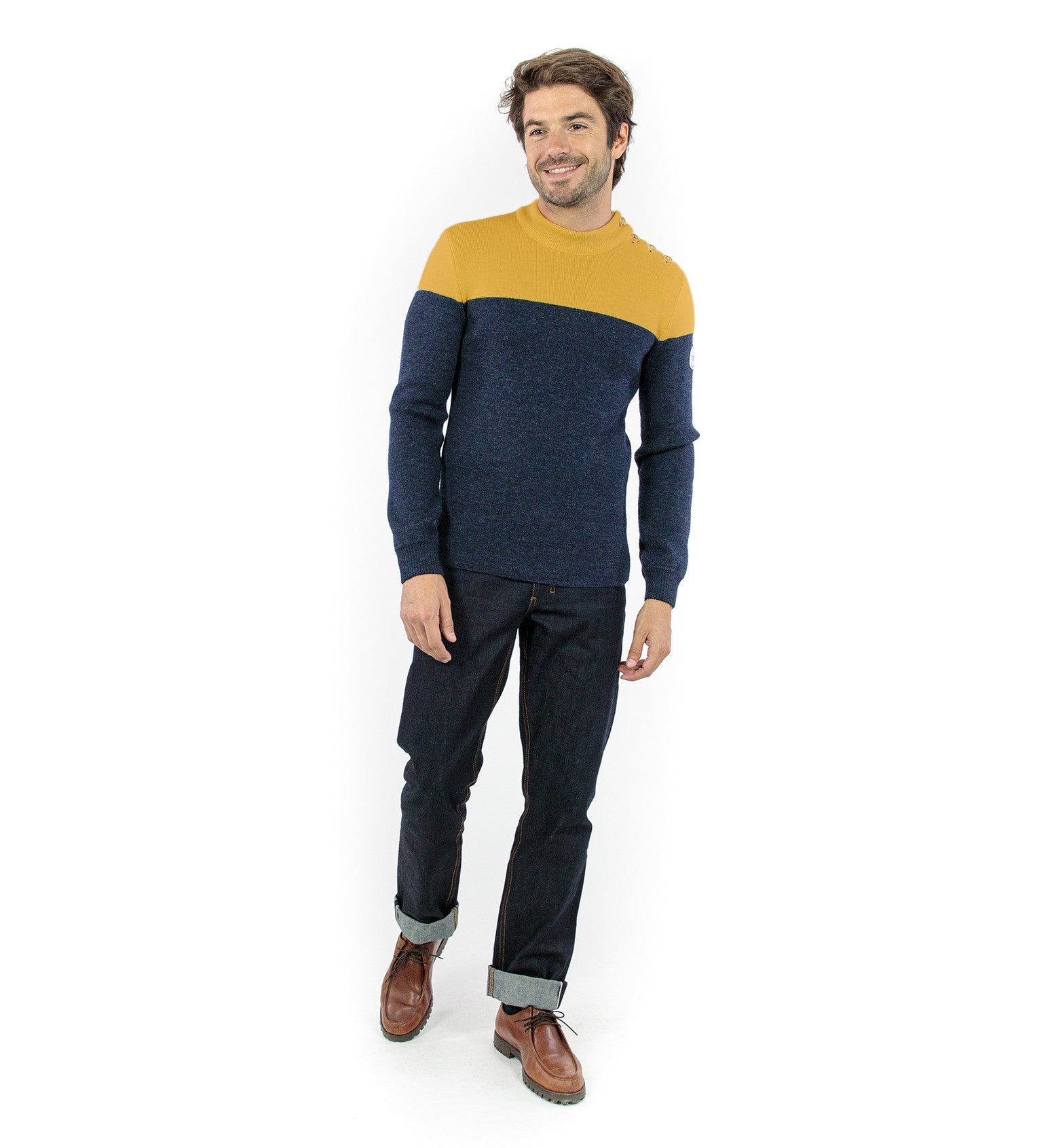 Ce pull en côte 1/1 est une réinterprétation du traditionnel pull marin. On aime son style bicolore et ses coudières fantaisies. Le pull Roland est fabriqué en France dans notre atelier à la Regrippière (44).