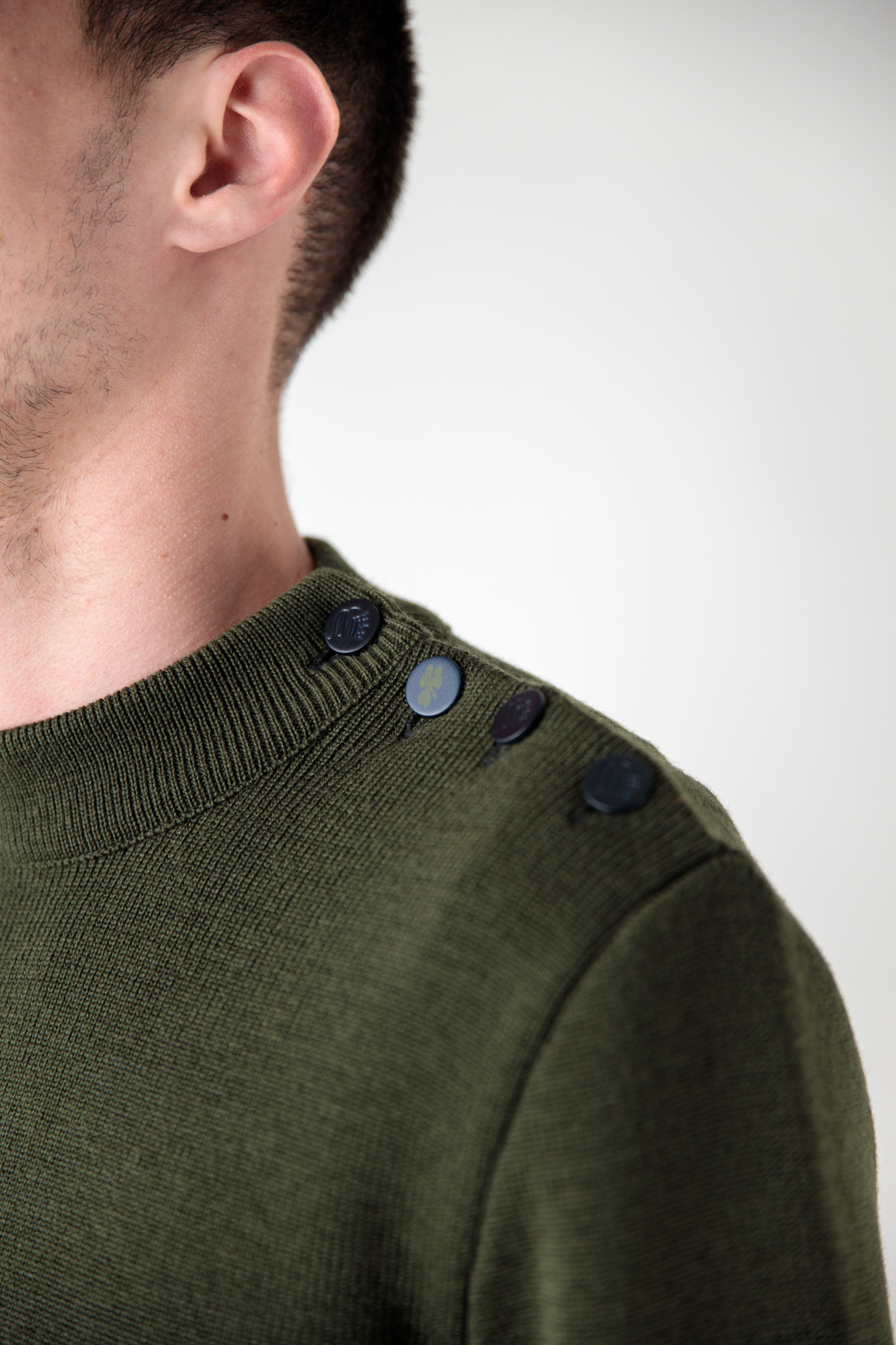 - Boutonnage épaule gauche avec un bouton trèfle signature du Comptoir Irlandais