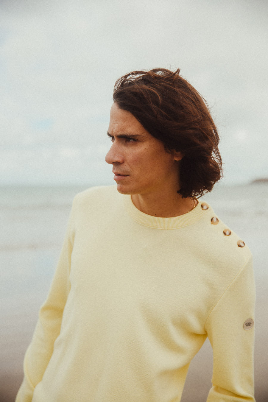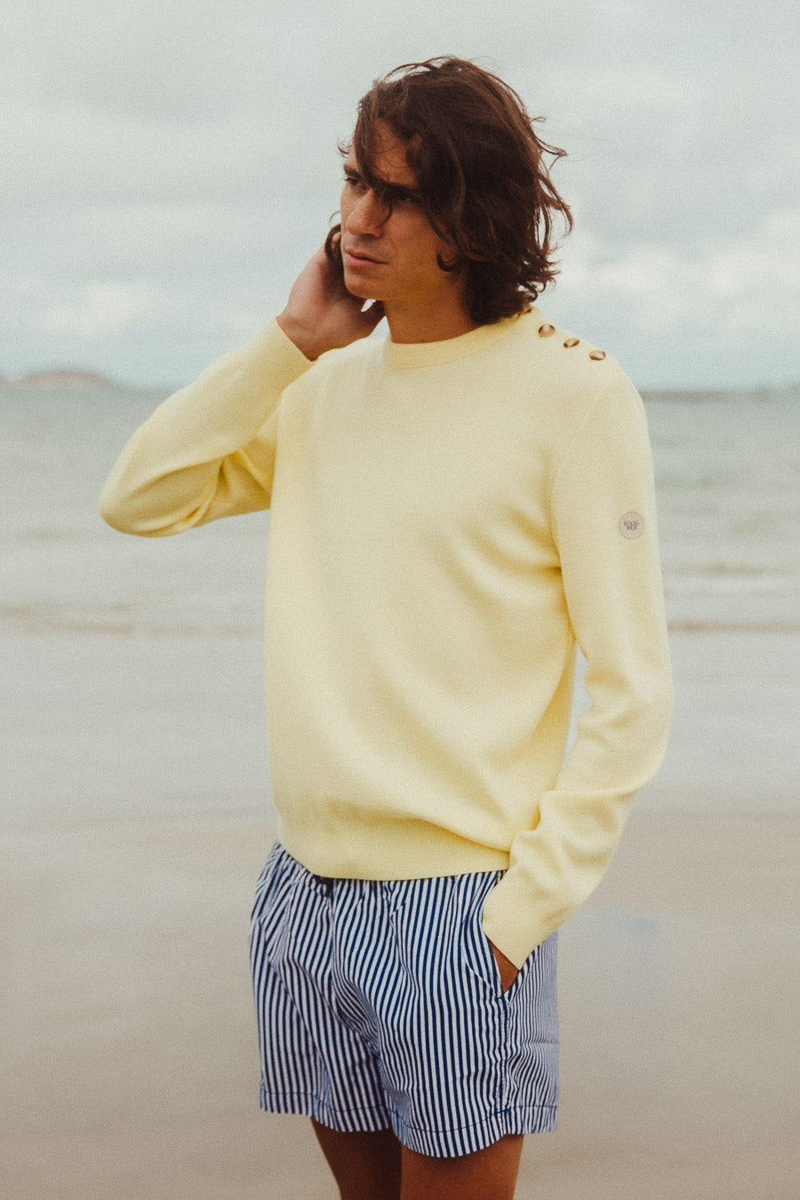 Le pull marin uni Armel se distingue par sa couleur jaune pâle, apportant une touche de fraîcheur et de luminosité à votre garde-robe. Fabriqué en 100 % laine mérinos fine, ce pull est non seulement élégant mais également respectueux de l'environnement grâce à sa laine certifiée RWS (Responsible Wool Standard), garantissant le bien-être animal et l'absence de pratiques nuisibles comme le mulesing.