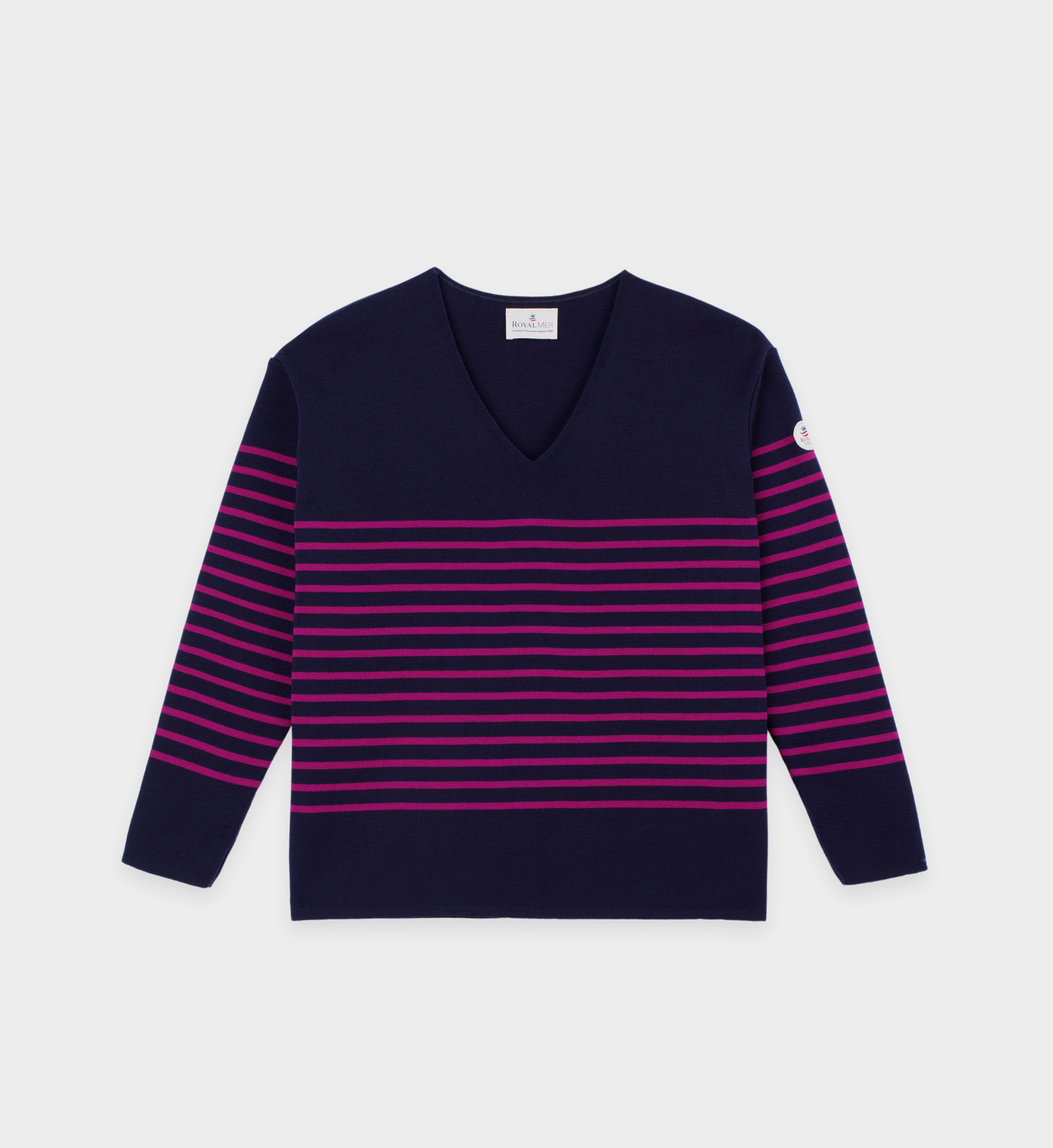 Plongez dans l'élégance intemporelle avec notre pull Laetitia bleu marine et violet conçu en 10% laine mérinos fine.