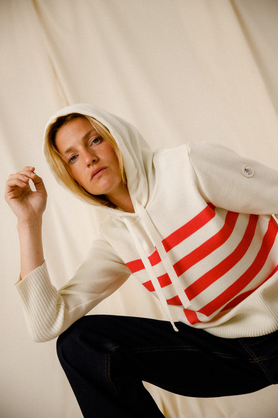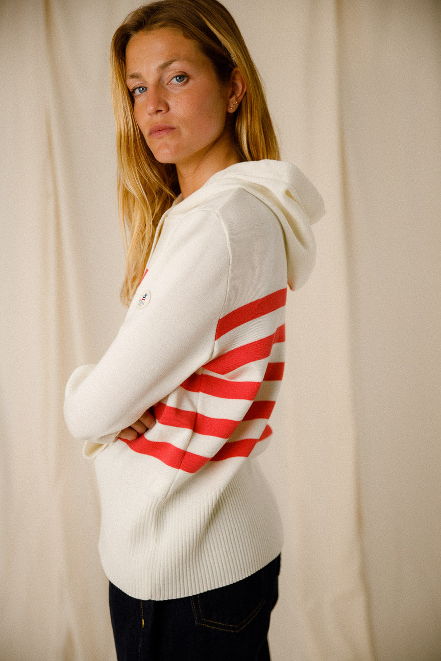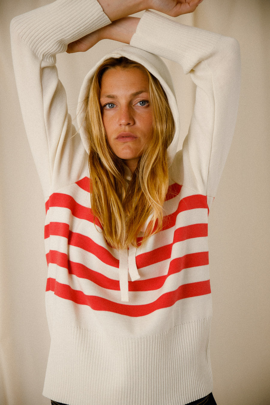Ce sweat à capuche arbore un élégant motif de rayures écru et corail chiné, apportant une touche de fraîcheur et de couleur à votre garde-robe. La coupe classique et le tricotage en maille côte 1/1 garantissent un ajustement parfait, tandis que les manches longues et le cordon de serrage en tricot ajoutent une fonctionnalité pratique.